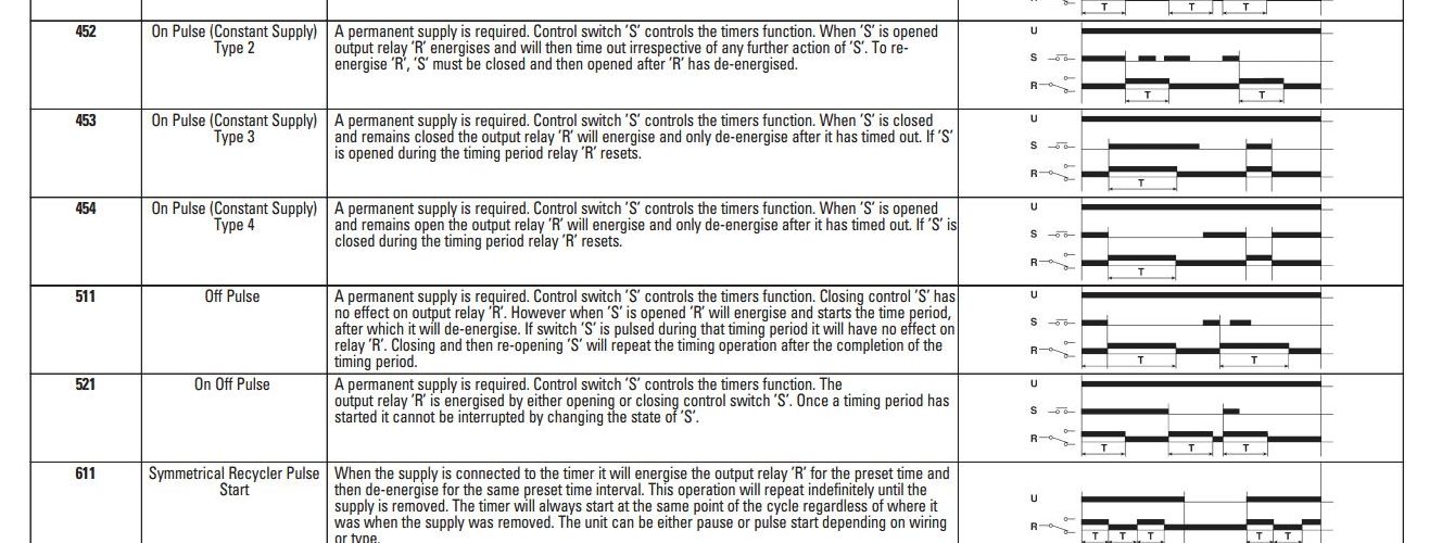 Description: Описание и графики стандартных функций реле времени, как, например: "On Delay (Control Switch Interruptible) Type 2", "On Pulse (Constant Supply) Type 4" и многие другие.