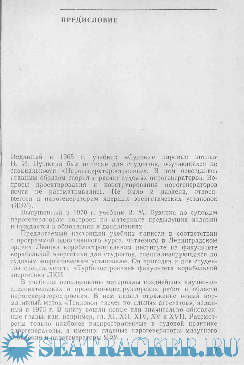 Настоящий учебник написан в соответствии с программой одноименного курса, читавшегося в Ленинградском ордена Ленина кораблестроительном институте на факультете корабельной энергетики для студентов, специализировавшихся по судовым энергетическим установкам и для студентов специальности «Турбиностроение» факультета корабельной энергетики ЛКИ. В учебнике использованы материалы позднейших научно-исследовательских и проектно-конструкторских работ в области парогенераторостроения. В нем нашёл отражение новый нормативный метод «Тепловой расчёт котельных агрегатов», изданный в 1973 г., рассмотрены только наиболее распространённые в судовой практике парогенераторы, а именно: главные парогенераторы мазутного отопления и парогенераторы ЯЭУ.