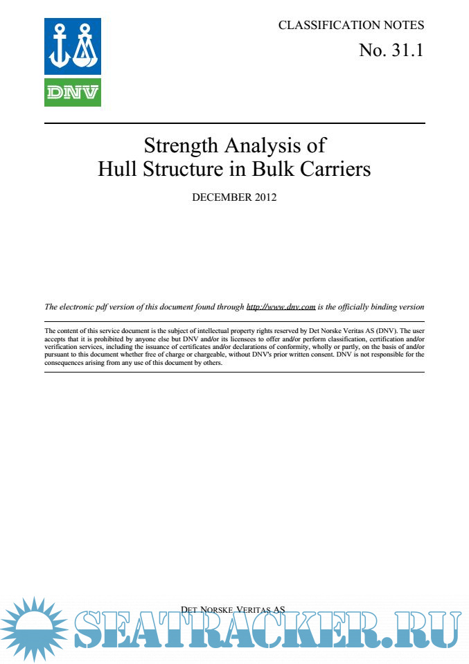 Year: 2012 Language: english Author: DNV Genre: Research papers Publisher: DNV Format: PDF Quality: eBook Pages count: 84 Description: This Classification Note covers only the strength analysis of hull structure in non CSR bulk carriers. For bulk carriers with CSR notation, the strength analysis of hull structure is covered in Rules Pt.8 Ch.2. This Classification Note is applicable for ships with class notation HC-A, HC-B, HC-C and HC-B. For ships with class notation HC-M, design load cases are given in Rules Pt.5 Ch.2 Sec.5 Table C1 based on the ships’ loading manual. For application of sea pressure load, cargo load and hold mass diagrams, relevant parts of this Classification Note may be applied. The structural analysis is generally related to primary strength members of the midship region of bulk carriers arranged with double bottom and single or double side. However, additional calculations may have to be carried out for fore- and aftmost holds as the hopper/top wing tank construction normally is changed significantly compared to the midship construction.
