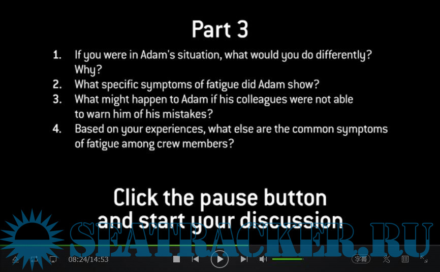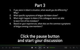 This film should be utilised as a collaborative tool to drive reflection and sharing of the seafarers’ personal experiences and insights on the subject. Their motivation to speak out is triggered by the guide questions shown after each segment of the film. Through their active involvement in the team discussions, the learners are expected to develop a much deeper understanding about fatigue, its symptoms and measures to avoid its occurrence.