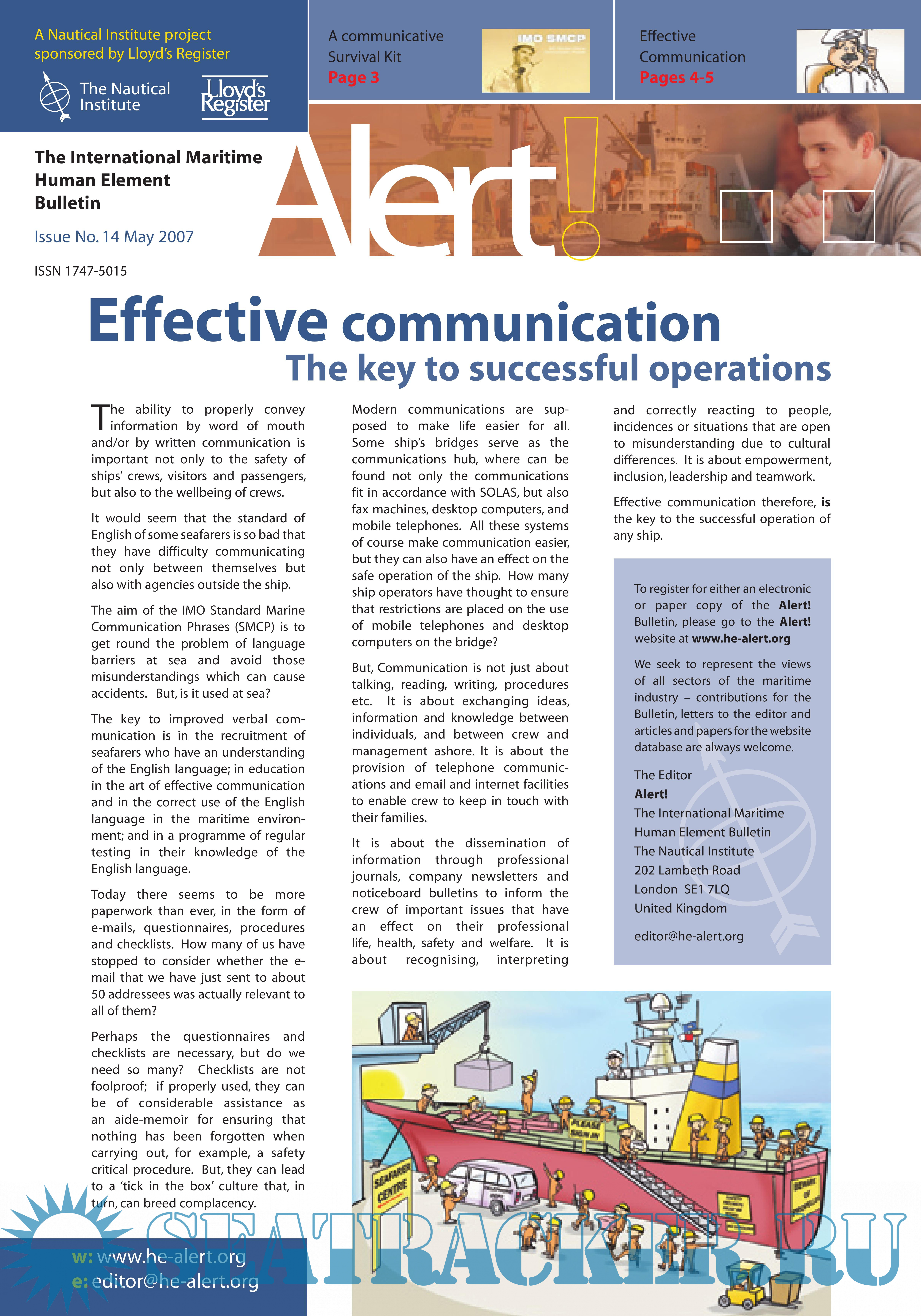 The purpose of Alert! is to establish a common database for, and to promote debate on, all maritime related human element research, focusing attention on areas of weakness that may lead to new research projects, while offering a vehicle for distributing and applying the results.