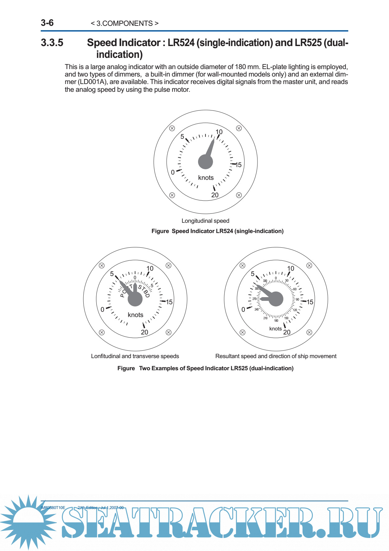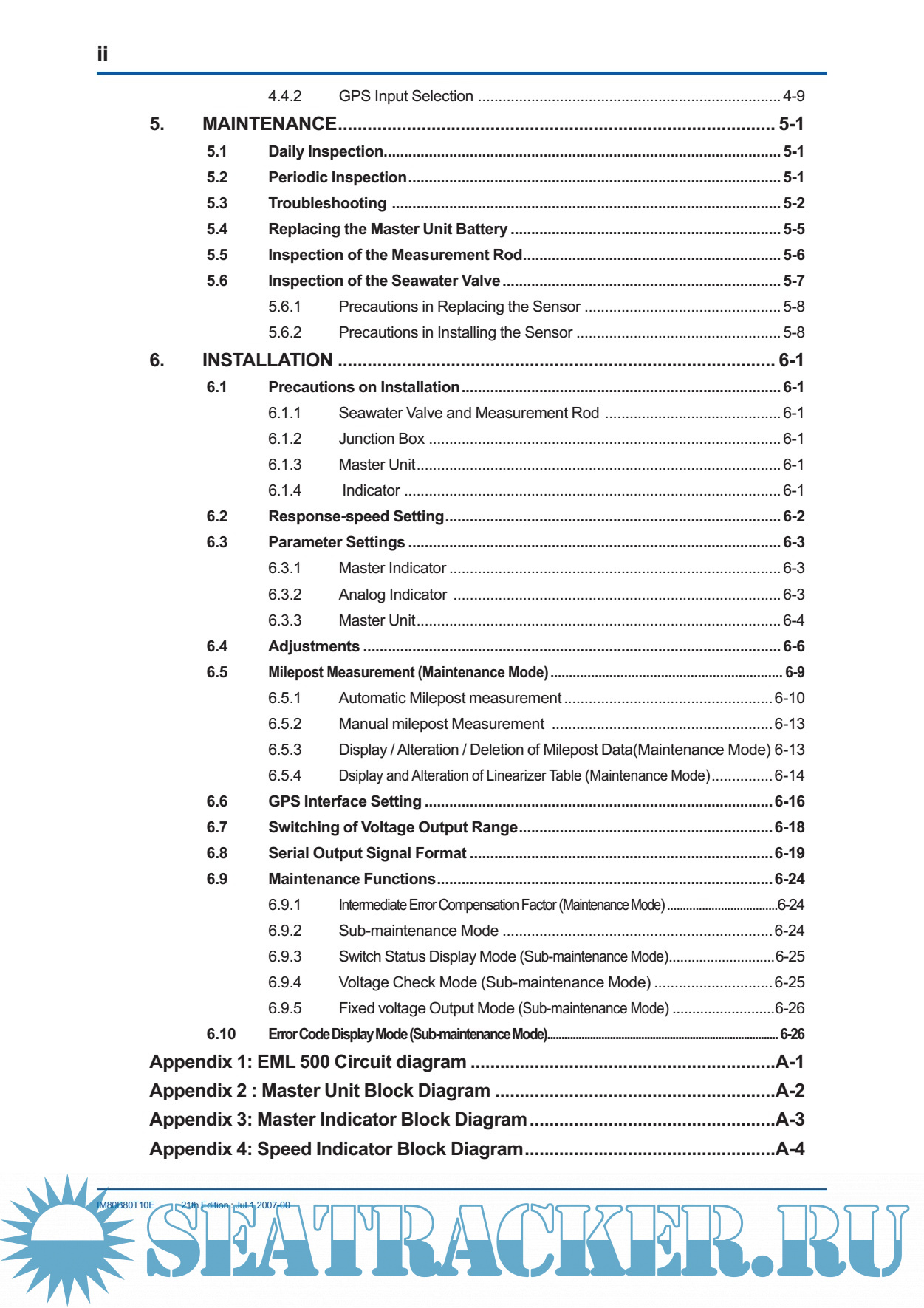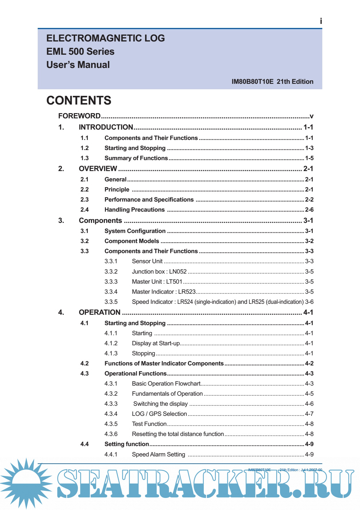 Year: 2007 Language: english Author: JRC Genre: Manual Publisher: JRC Edition: 21 Format: PDF Quality: eBook Pages count: 85 Description: The EML 500 series of electromagnetic logs successfully meets the performance requirements prescribed by IMO resolution A478 (XII), and has been approved by the Ministry of Land,Infrastructure and Transport Japan (approval no.:3795). The EML500 features: (1) Versatile external interfaces · Pulse output (photocoupler / contact) · Digital output (NMEA0183) · Analog speed output (0V DC to 5V DC) · Alarm contact and interface with the GPS (2) High reliability The use of highly integrated circuits, such as microprocessors, provides excellent reliability due to a reduction in parts and the elimination of moving parts. (3) Master indicator for displaying the speed and distance (4) Variety of sensors available to meet various installation requirements. A dual-axis sensor can measure not only the longitudinal speed, but also the transverse speed. (5) Built-in self-diagnostic function