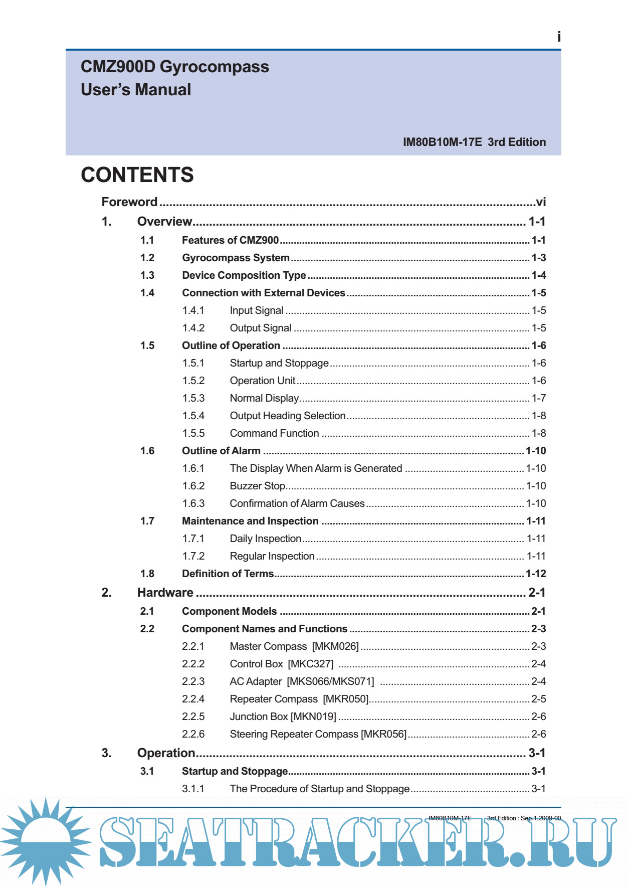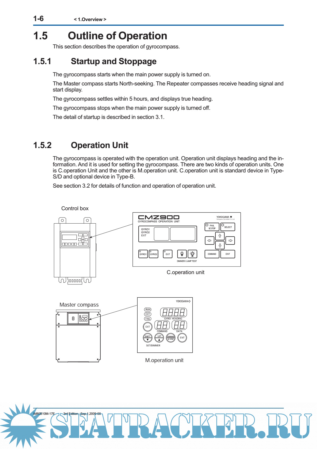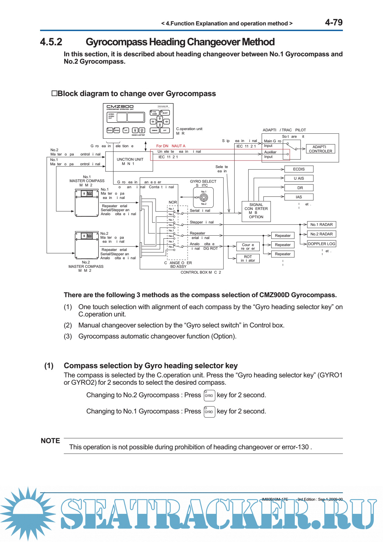Year: 2009 Language: english Author: JRC Genre: Manual Publisher: JRC Edition: 3 Format: PDF Quality: eBook Pages count: 230 Description: The CMZ900 Gyrocompass fully conforms to the technical requirements of the IMO resolution A.424 (XI), gyrocompass performance standards, as well as to JIS F9602, Class A standards. The anti-vibration structure has been strengthened and improvement of the follow-up performance has been achieved, leading to increased rigidity of the gyrocompass in all types of ships, from small to large.