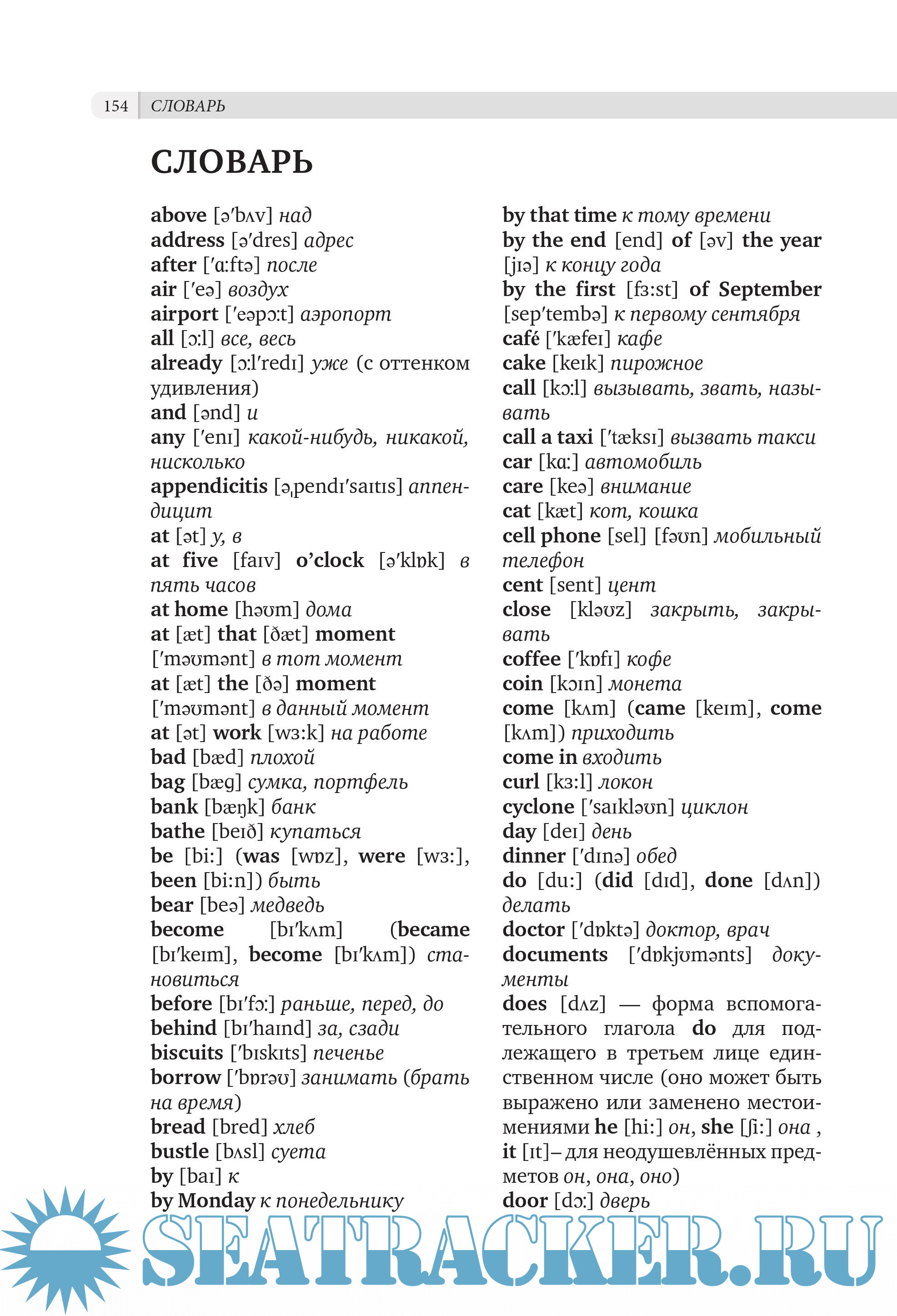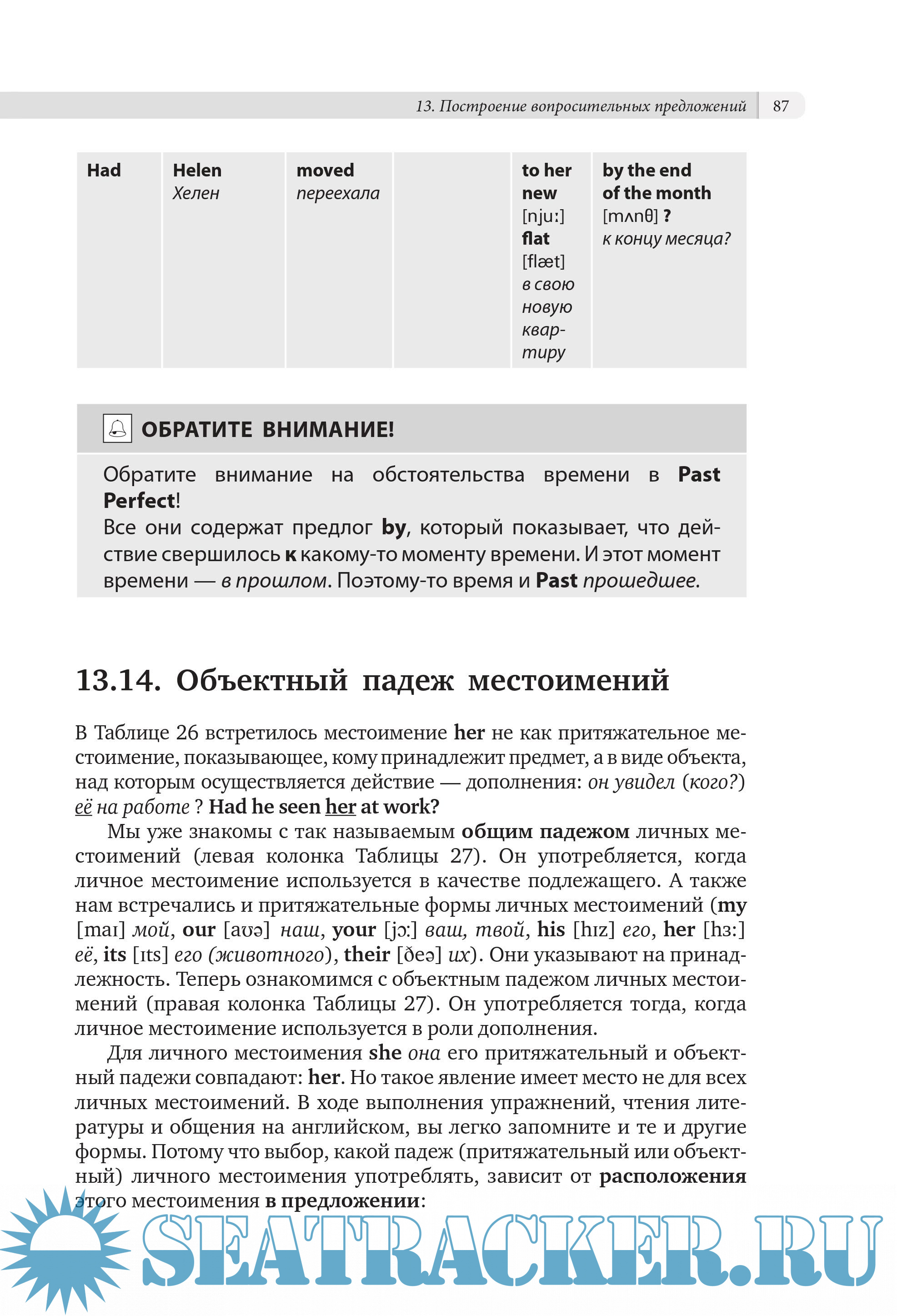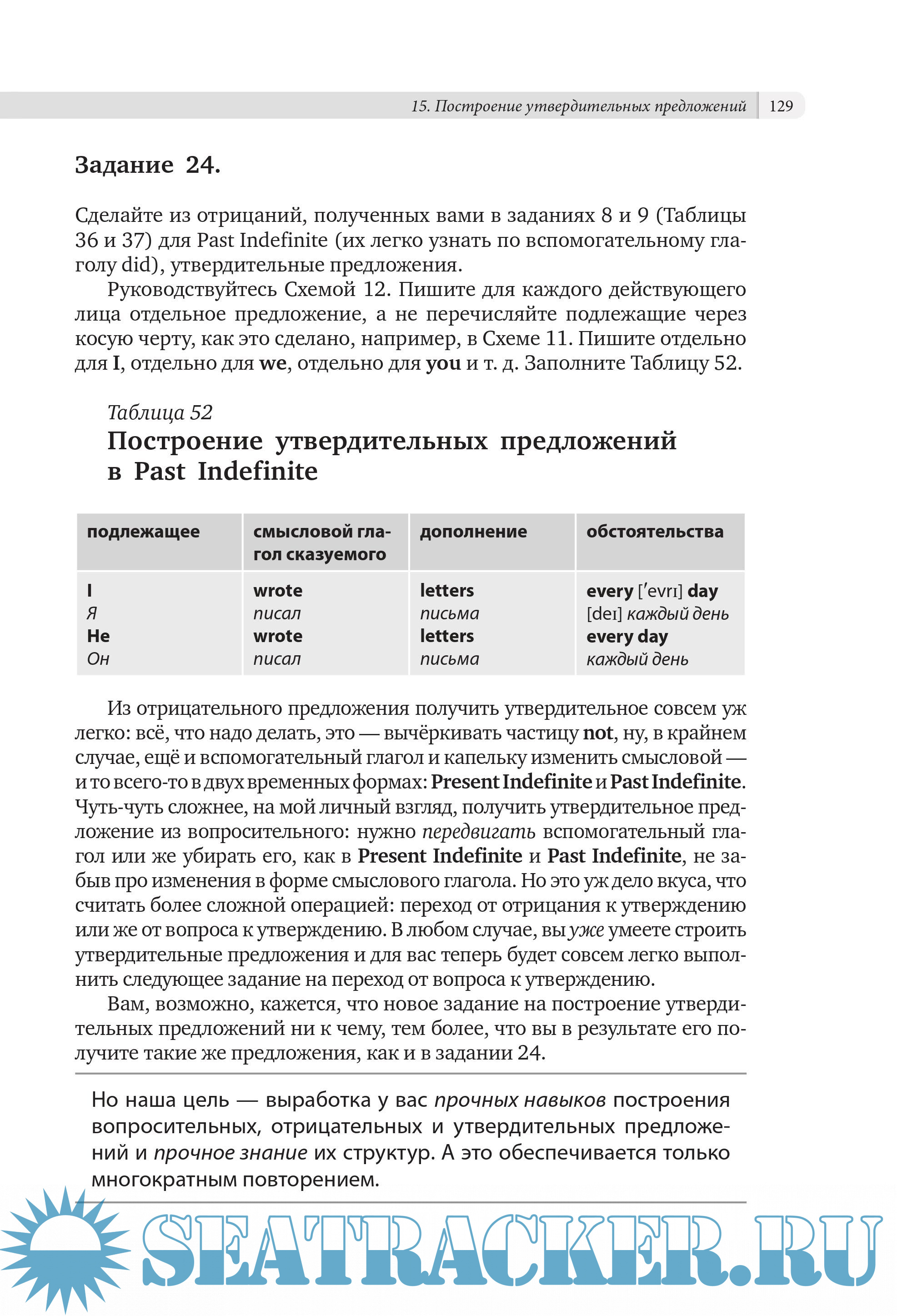 Введение 3 1. Почему вы сможете 4 2. Английский алфавит, звуки, буквы 9 3. Произношение звуков, на которое стоит обратить внимание 14 4. Как запомнить алфавит и что угодно и преодолеть психологические барьеры 16 5. Классификация звуков и букв 17 6. Чтение согласных 18 7. Как получить прочные знания и навыки 27 8. Типы чтения гласных 29 9. Чтение гласных в буквосочетаниях 33 10. Как запомнить правила чтения и вообще иметь высокий уровень грамотности в любом языке 37 11. Временные формы 38 12. Состав временных форм 40 13. Построение вопросительных предложений 43 13.1. Идея построения вопроса 43 13.2. Общие вопросы во временах группы Indefinite 52 13.3. Принцип расположения обстоятельств времени 61 13.4. Шпаргалки по формам смысловых и вспомогательных глаголов 63 13.5. Общие вопросы в Present Continuous 66 13.6. Понятие об артикле 68 13.7. Общие вопросы в Past Continuous 70 13.8. Принцип формирования вспомогательного глагола в комбинированных временных формах 74 13.9. Общие вопросы в Future Continuous 78 13.10. Общие вопросы в Present Perfect 81 13.11. Особенности чтения окончания ed 84 13.12. Особенности правописания глаголов с окончанием ed 85 13.13. Общие вопросы в Past Perfect 85 13.14. Объектный падеж местоимений 87 13.15. Общие вопросы в Future Perfect 89 13.16. Аналогии в обстоятельствах времени 93 13.17. Аналогия построения вопросов в различных временных формах с одним и двумя вспомогательными глаголами 94 14. Построение отрицательных предложений 100 14.1. Как строить отрицательные предложения 100 14.2. Задания на построение отрицательных предложений 105 14.3. Сокращённые формы сочетаний вспомогательных глаголов с частицей not 115 14.4. Сокращённые формы вспомогательных глаголов 117 15. Построение утвердительных предложений 118 15.1. Отличие утвердительного предложения от вопросительного 118 15.2. Получение из утвердительного предложения вопросительного 122 15.3. Отличие утвердительного предложения от отрицательного 123 16. Нюансы употребления артиклей 131 17. Сильные глаголы 132 17.1. Глагол be как сильный глагол 134 17.2. Модальные глаголы 137 18. Повелительные предложения 148 Наши результаты 151 Грамматический справочник 152 Имена собственные 153 Словарь 154