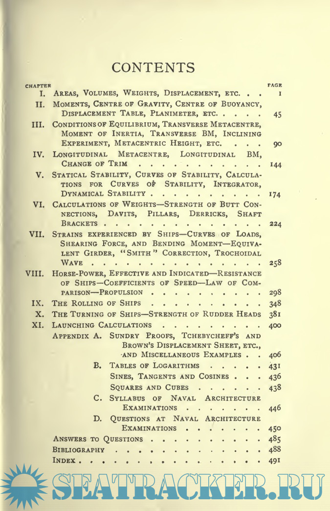 This book has been prepared in order to provide students and draughtsmen engaged in Shipbuilders' and Naval Architects drawing offices with a text-book which should explain the calculations which continually have to be performed. It is intended, also, that the work, and more especially its later portions, shall serve as a text-book for the theoretical portion of the examinations of the Science and Art Department in Naval Architecture. It has not been found possible to include all the subjects given in the Honours portion of the syllabus, such as advanced stability work, the rolling of ships, the vibra- tion of ships, etc.