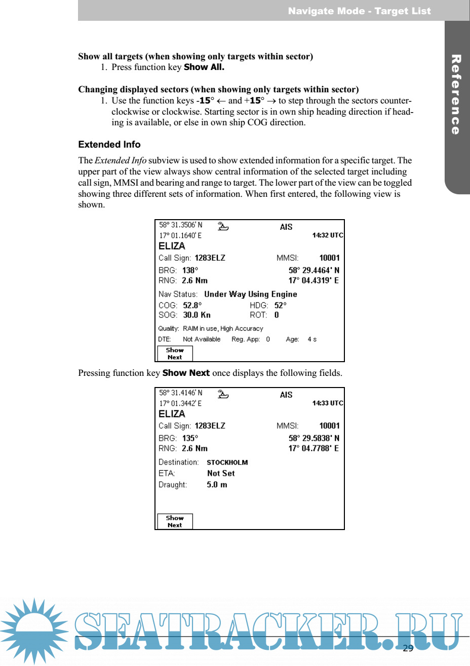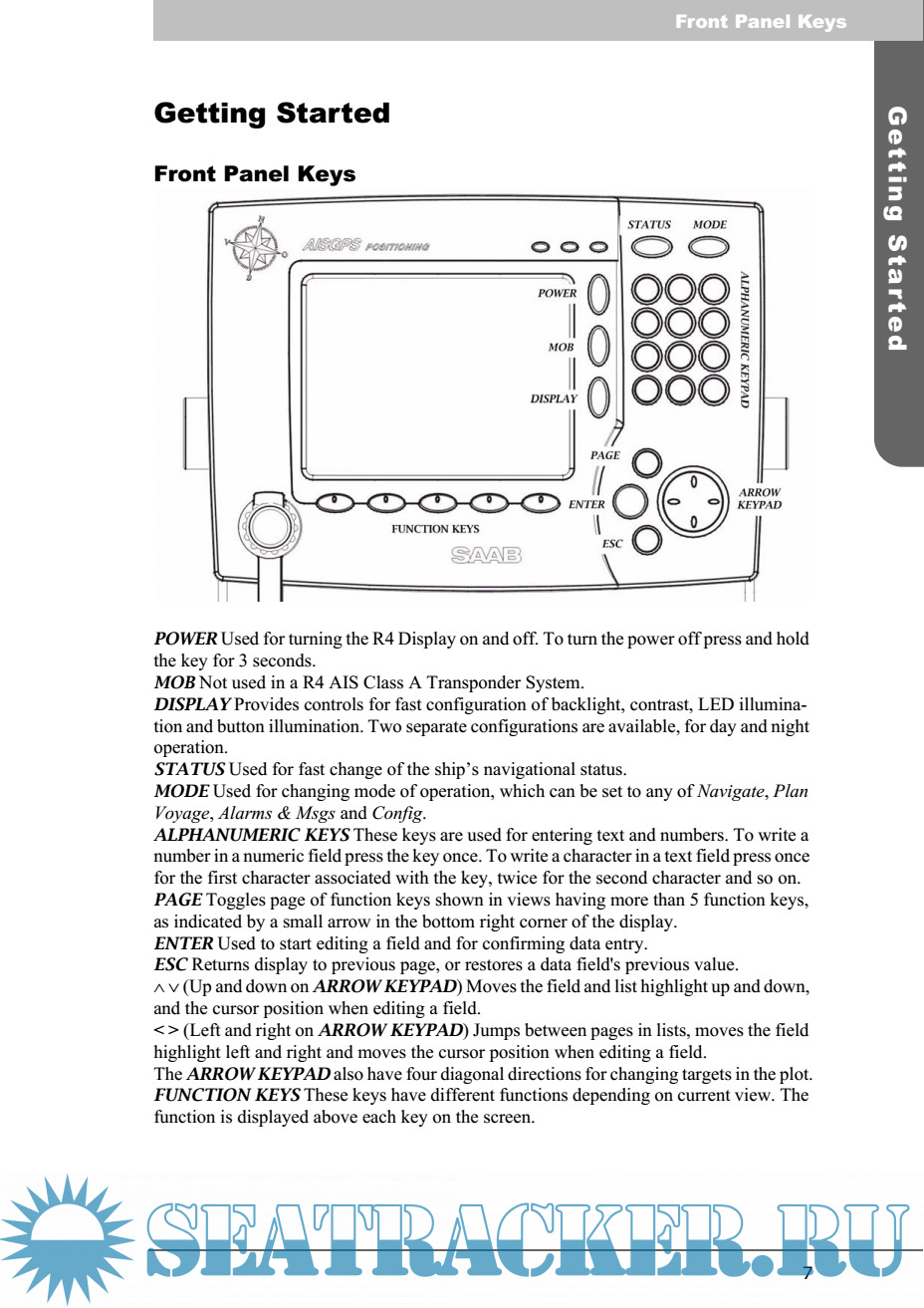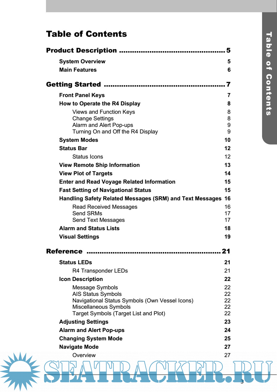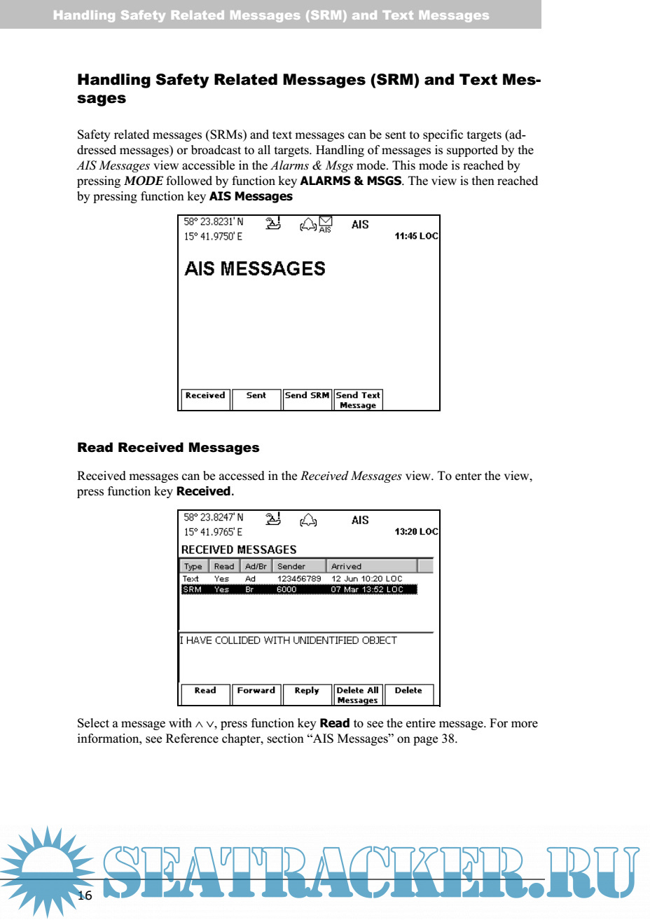 Year: 2006 Language: english Author: SAAB Genre: Manual Publisher: SAAB Edition: H Format: PDF Quality: eBook Pages count: 72 Description: The R4 AIS Class A Transponder System consists of an R4 AIS Transponder and an R4 Display. The R4 Transponder consists of a radio transceiver unit, a GPS receiver and a controller unit. The transceiver consist of one transmitter and three independent VHF receivers, two tunable TDMA receivers and one DSC receiver. The transmitter alternates its transmissions between the two operating TDMA channels and can also be used to reply a DSC interrogation (ITU-R M.825-3, Annex 1). The controller unit creates and schedules data packets (containing dynamic, static and voyage related data) for transmission based on the IMO performance standard for AIS. The R4 Transponder shall be connected to the ship’s sensors as required by the installation guidelines published by IALA. The R4 Transponder can interface external navigation and presentation systems that support required IEC 61162-1 sentences as set out in the Installation Manual. The R4 Transponder is prepared for connection to Long Range systems like Inmarsat C. The R4 Display provides a graphical user-friendly interface to the system. Via the display it is possible to plot the location of other ships, aids to navigation and search and rescue vessels. Information about other vessel can be listed sorted by range and optionally filtered showing only vessels within a specific sector. The display can also be used to send and receive messages, perform configuration as well as supervise the systems status.