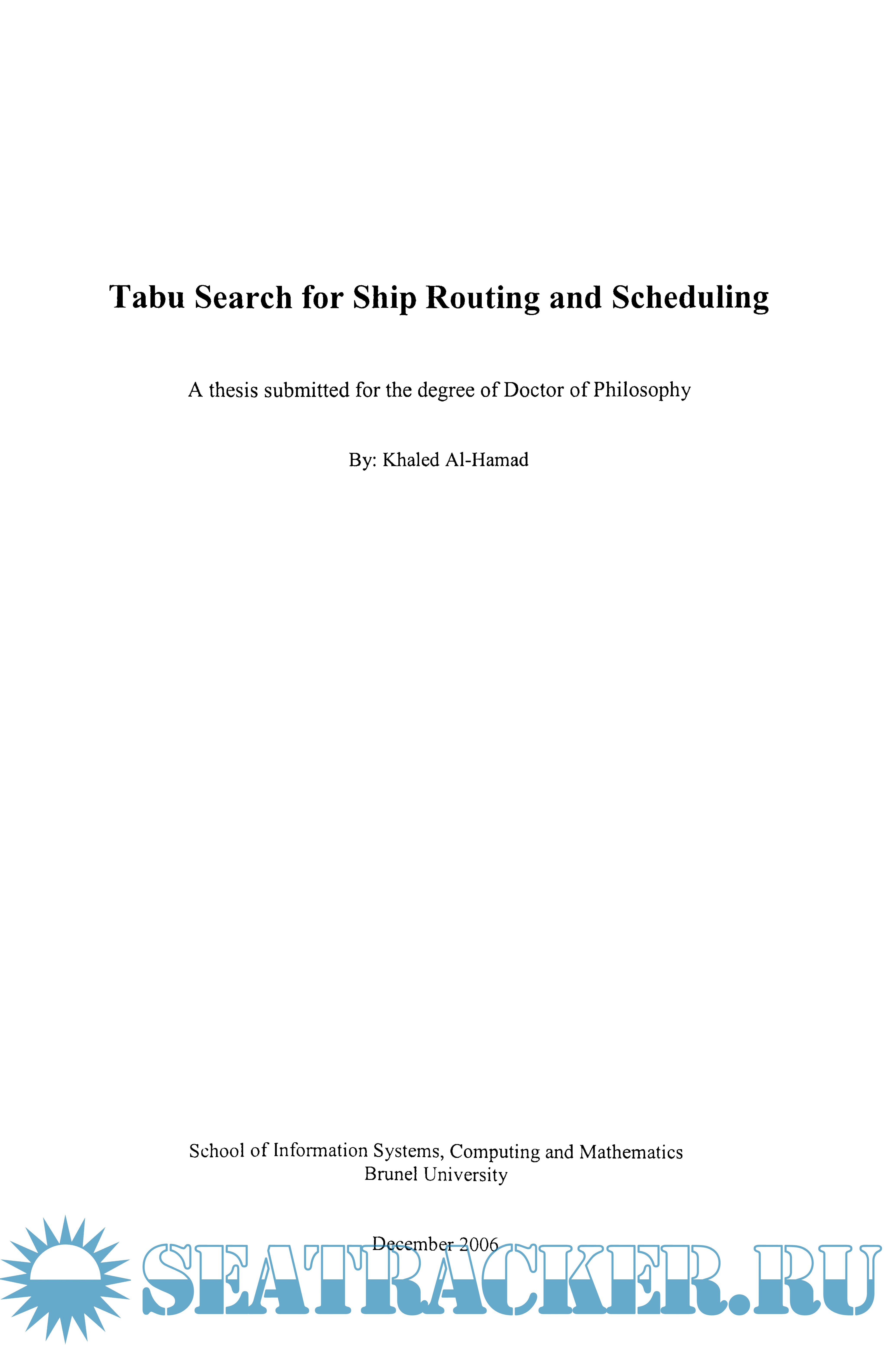 Year: 2006 Language: english Author: Khaled Al-Hamad Genre: Research papers Publisher: School of Information Systems, Computing and Mathematics Brunel University Format: PDF Quality: eBook Pages count: 155 Description: This thesis examines exact and heuristic approaches to solve the Ship Routing and Scheduling Problem (SRSP). The method was developed to address the problem of loading cargos for many customers using heterogeneous vessels. Constraints relate to delivery time windows imposed by customers, the time horizon by which all deliveries must be made and vessel capacities. The objective is to minimise the overall operation cost, where all customers are satisfied. Two types of routing and scheduling are considered, one called single-cargo problem, where only one cargo can be loaded into a ship, and the second type called multi-cargo problem, where multiple products can be carried on a ship to be delivered to different customers. The exact approach comprises two stages. In the first stage, a number of candidate feasible schedules is generated for each ship in the fleet. The second stage is to model the problem as a set partitioning problem (SPP) where the columns are the candidate feasible schedules obtained in the first stage. The heuristic approach uses Tabu Search (TS). Most of the TS operations, such as insert and swap moves, tenure, tabu list, intensification, and diversification are used. The results of a computational investigation are presented. Solution quality and execution time are explored with respect to problem size and parameters controlling the tabu search such as tenure and neighbourhood size. The results showed that the average of the solution gap between TS solution and SPP solution is up to 28% (for small problems) and up to 18% for large problems. However, obtaining an optimal solution requires a large amount of computer time to produce the solution compared to obtaining approximate solutions using the TS approach. The use of Tabu Search for SRSP is novel and the results indicate that it is viable approach for large problems.