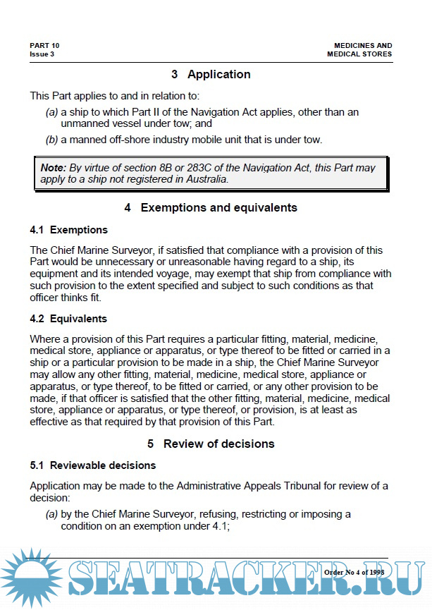 1 Definitions 2 Purpose 3 Application 4 Exemptions and equivalents 5 Review of decisions 6 Penal provisions 7 Medicines and medical stores 8 Medical cabinet 9 Dispensing certain drugs 10 Inspection 11 Prescribed matters 12 Transition Appendix 1 Scale of medicines and medical stores to be carried on board a ship Appendix 2 Contents of doctor's bag Appendix 3 Requirements for labelling, packaging and storage Appendix 4 Specifications for disinfectants