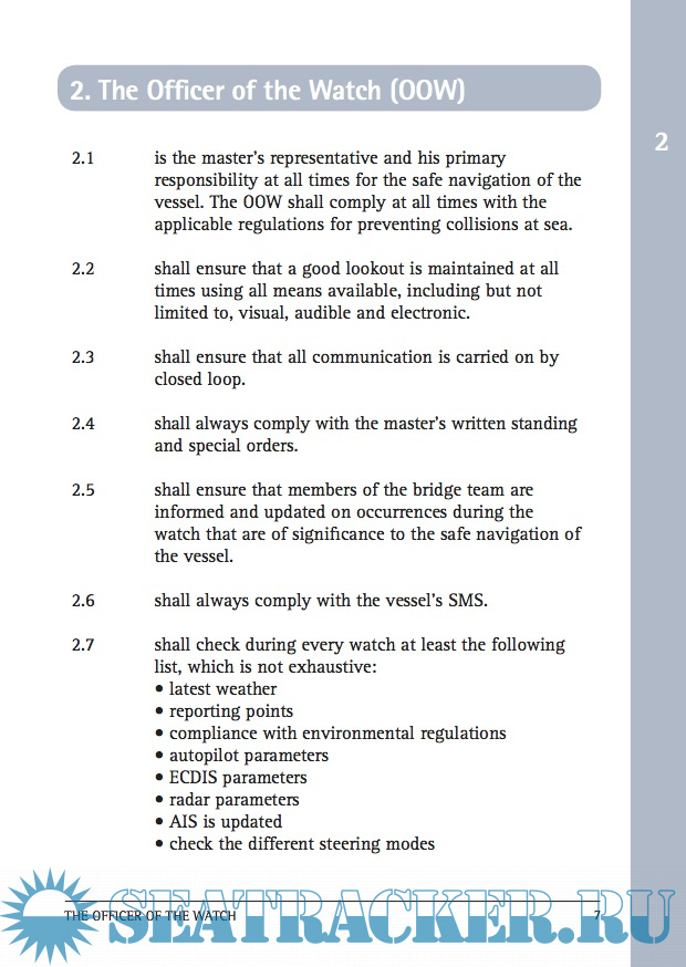 Description: The Bridge Instructions are based in acccordance with IMO’s International Convention on Standards of Training, Certification and Watchkeeping for Seafarers, 1978, as amended in 1995 and 2010 as per the Manila amendments (STCW-Convention), ICS’ Bridge Procedures Guide and The Nautical Institute’s Bridge Watchkeeping.
