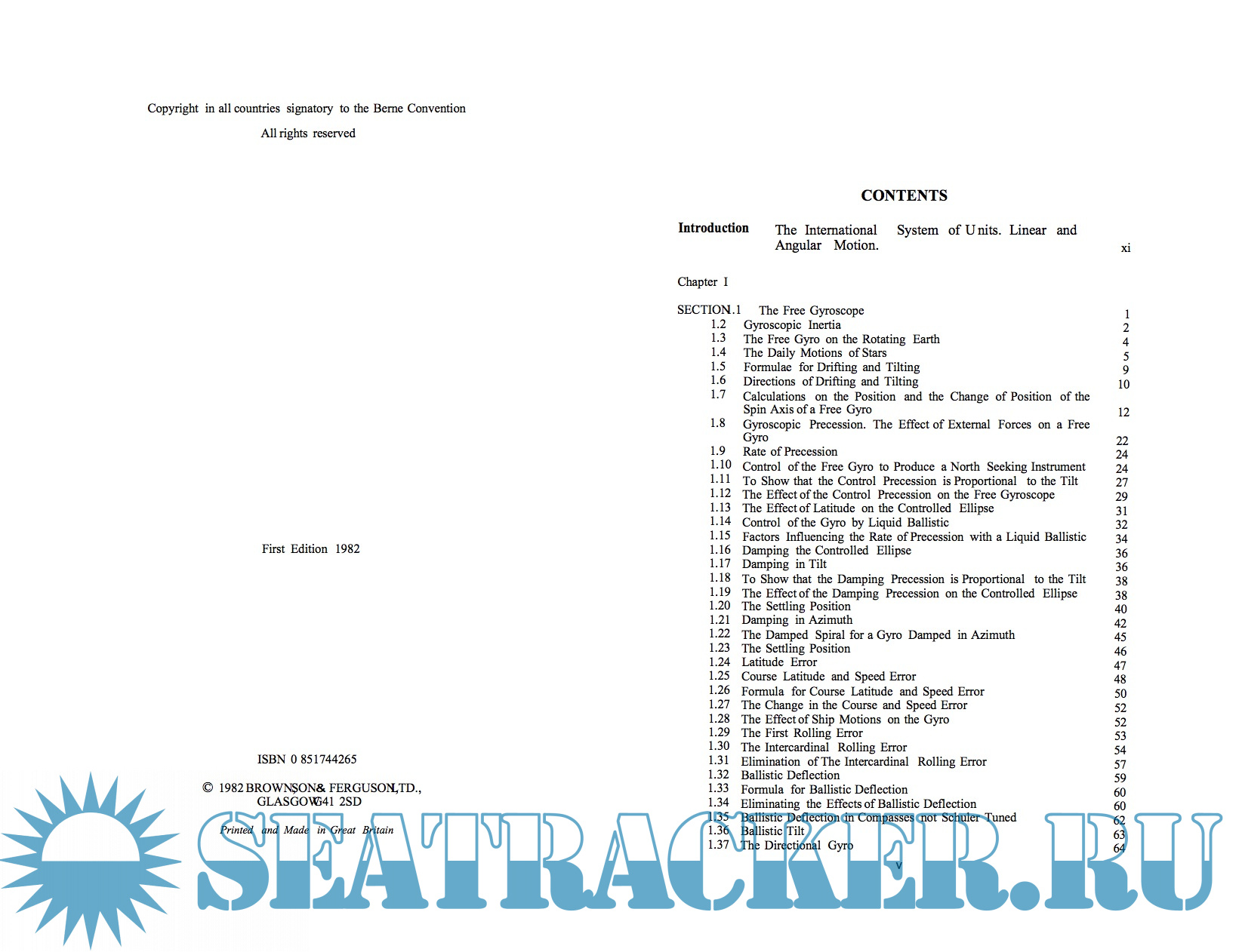 Year: 1982 Language: english Author: Frost A. Genre: Reference book Publisher: BROWN, SON & FERGUSON LTD. NAUTICALPUBLISHERS Edition: 1st ISBN: 0851744265 Format: PDF Quality: OCR without errors Pages count: 82 Description: Modern marine gyro compasses are well proven and give excellent service with a minimum of attention and maintenance by the operator. They have, on most merchant and naval vessels, become the primary directional reference, leaving the magnetic compass very much the reliable stand-by. But as with the magnetic compass the prudent navigator must understand the equipment upon which he relies so much, and appreciate its limitations and the conditions which lead to the errors to which it may be subject. The ship's officer will therefore find the theory of the gyro compass at all levels of his studies for certification. Marine Gyro Compasses for Ships' 0fficers has been written to cover the syllabuses for all grades of Department of Trade certificates of competency for deck officers in the Merchant Navy. The first section of the text discusses the free gyroscope and its properties which enable it to be converted into an instrument which provides a north reference. Methods of control of the gyro and of damping to a settling position are fully discussed. Also the theory of the gyro compass errors and how they may be corrected is introduced. In the subsequent chapters the commercial gyro compasses which are most commonly found in British Merchant ships are described to illustrate how the theory discussed is put into practice. The text is liberally illustrated with line drawings of exceptional clarity. These with the clear and concise explanations make Marine Gyro Compasses for Ship's Officers the ideal reference in this subject.