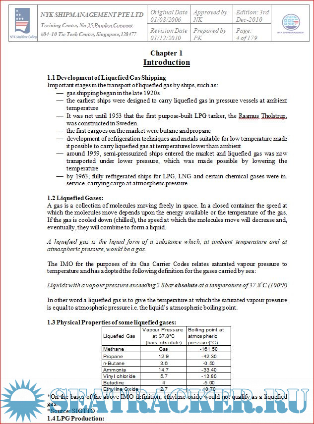 Year: 2010 Language: english Author: NYK Maritime College Genre: Training courses Publisher: NYK Maritime College Edition: 3rd Format: DOC Quality: eBook Pages count: 179 Description: This course explains the basics of Liquefied Petroleum Gas (LPG) Carriers industry, their operation, applicable statutory and special requirements including safety related matters concerning the type of cargo grades, etc. Participants will gain a deep and qualitative understanding of ‘Liquefied Petroleum Gas (LPG)’ sector in connection with the IMO Convention and IGC Code.
