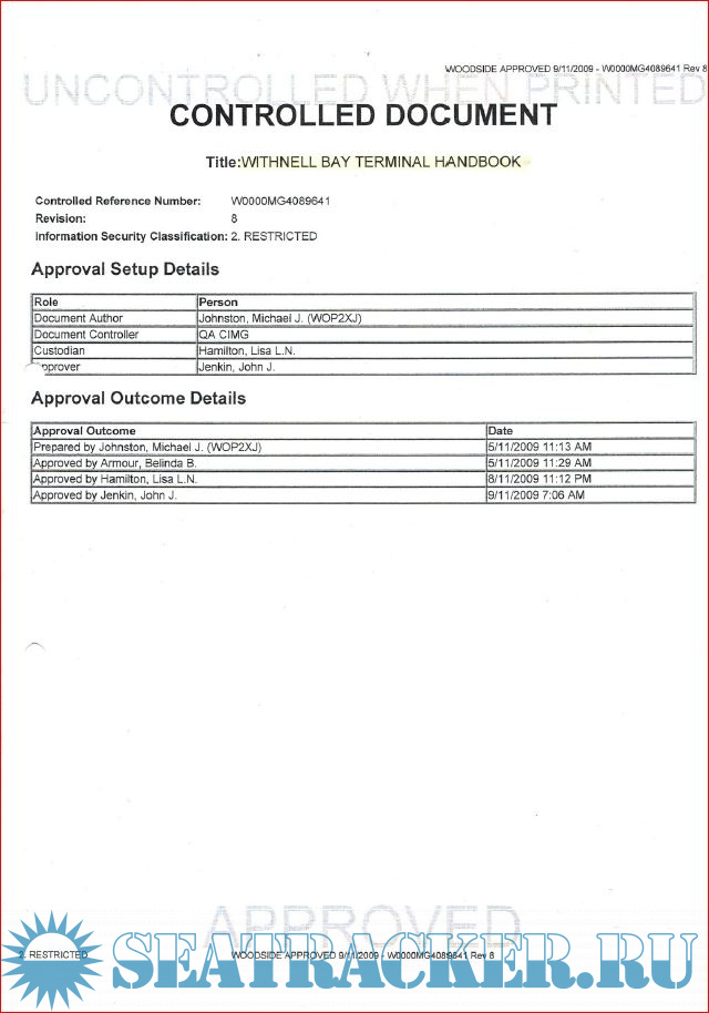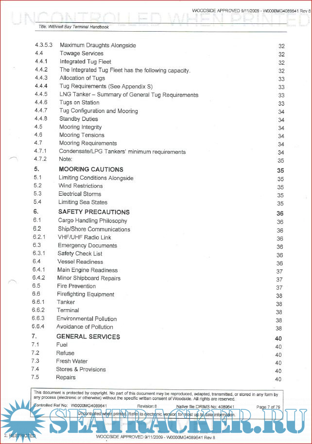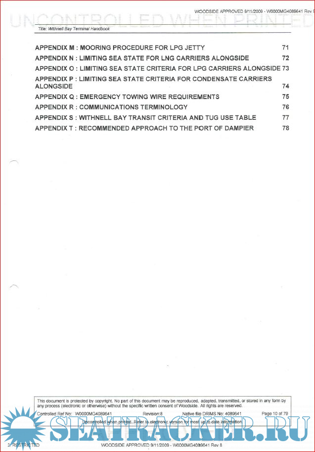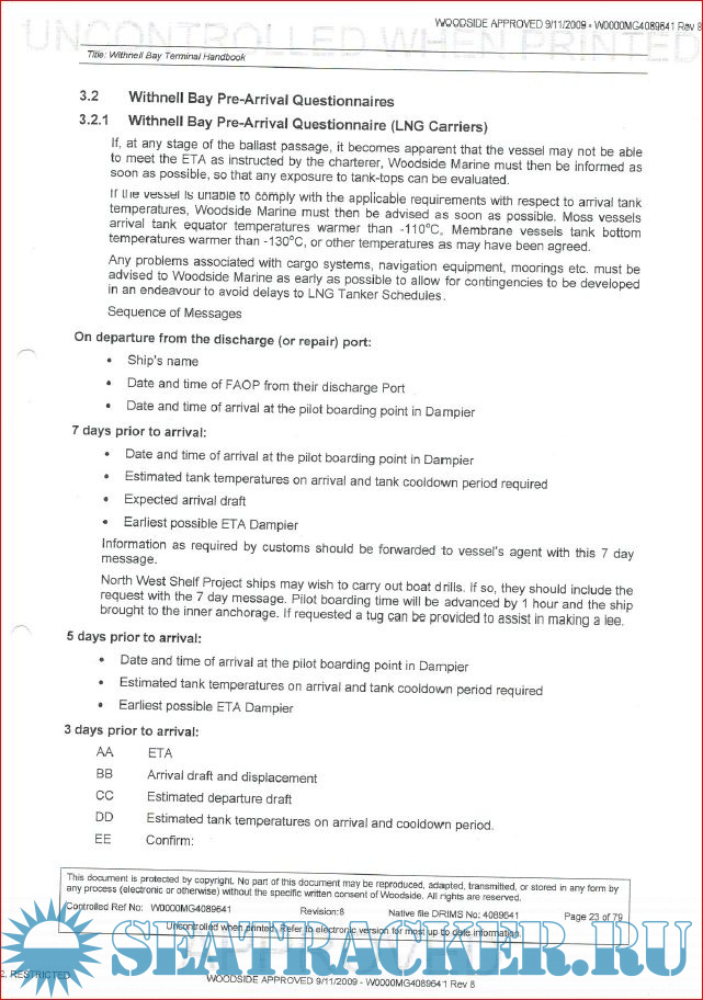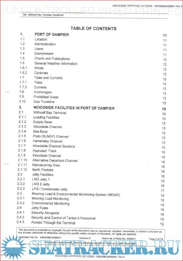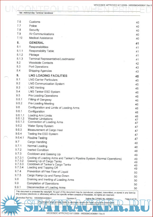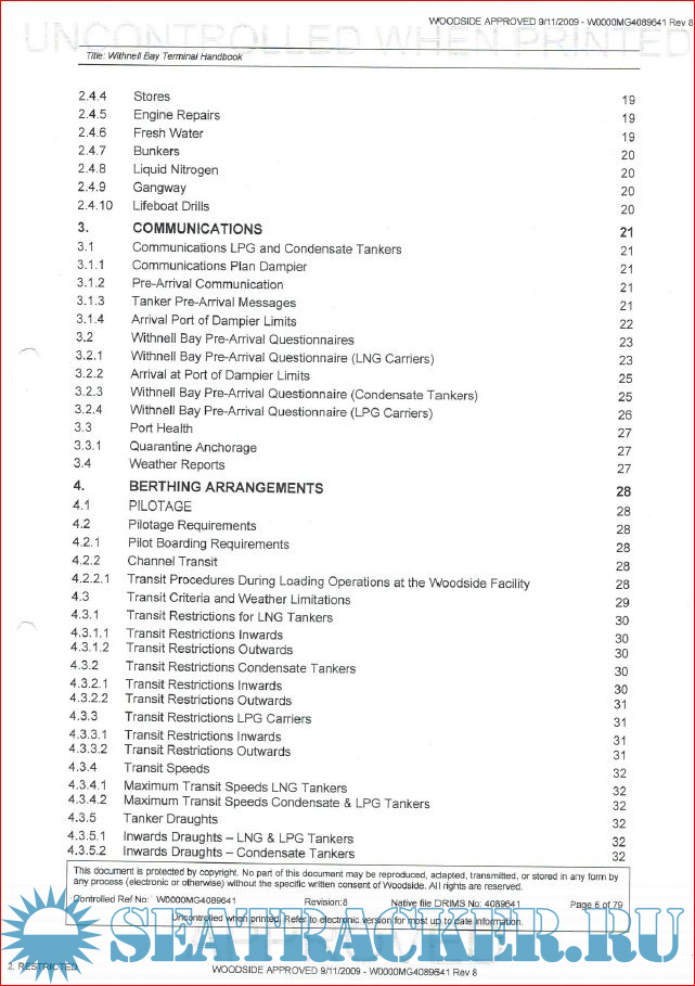 Year: 2009 Language: english Author: Woodside Genre: Handbook Format: PDF Quality: Scanned pages Pages count: 80 Description: This document is intended to acquaint owners, Charters and Masters of Vessels with the general conditions, terminal facilities and available services at the Withnell Bay Terminal.