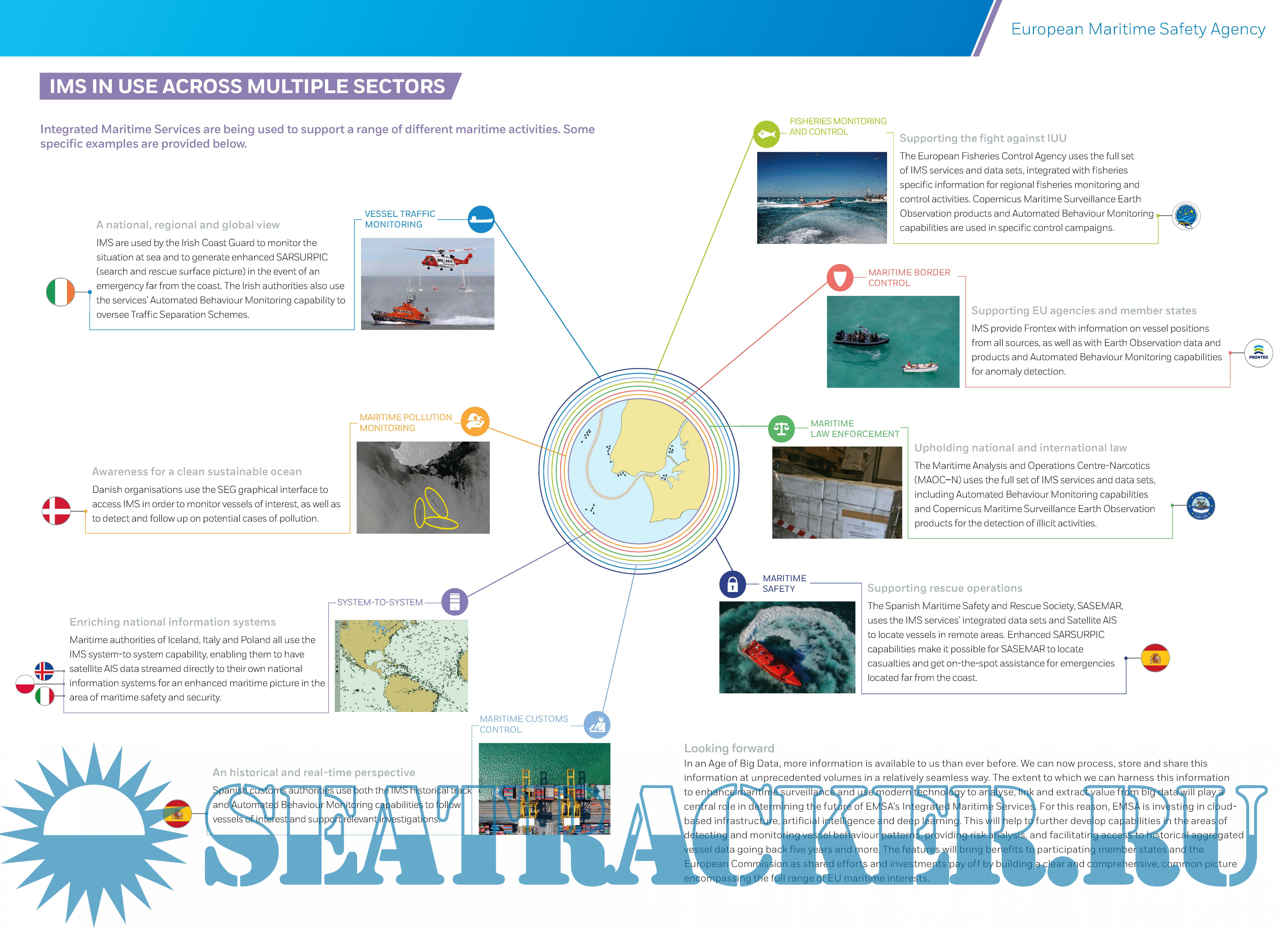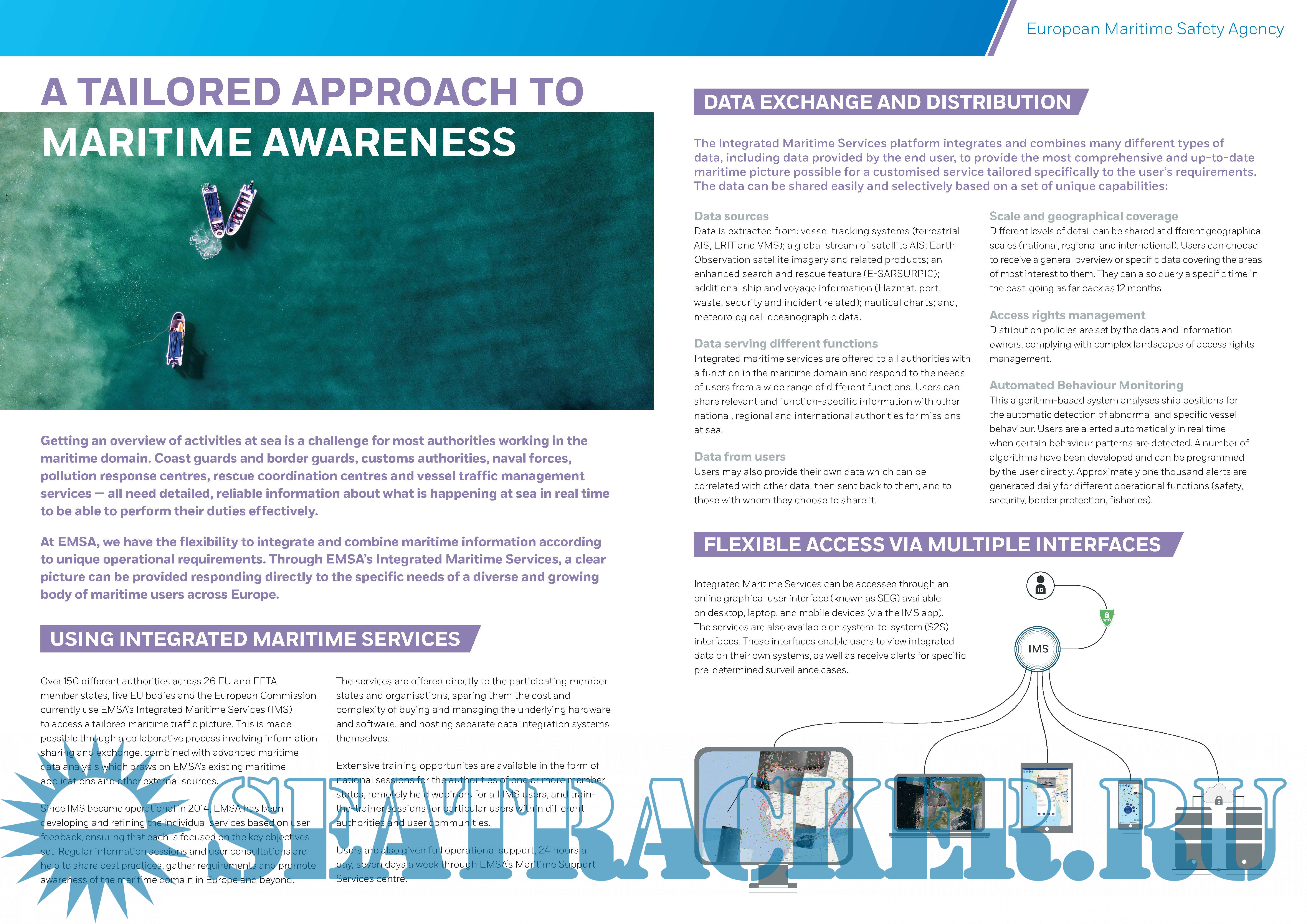 Year: 2018 Language: english Author: EMSA Genre: Presentation Format: PDF Quality: eBook Pages count: 5 Description: The Integrated Maritime Services platform integrates and combines many different types of data, including data provided by the end user, to provide the most comprehensive and up-to-date maritime picture possible for a customised service tailored specifically to the user’s requirements. The data can be shared easily and selectively based on a set of unique capabilities.