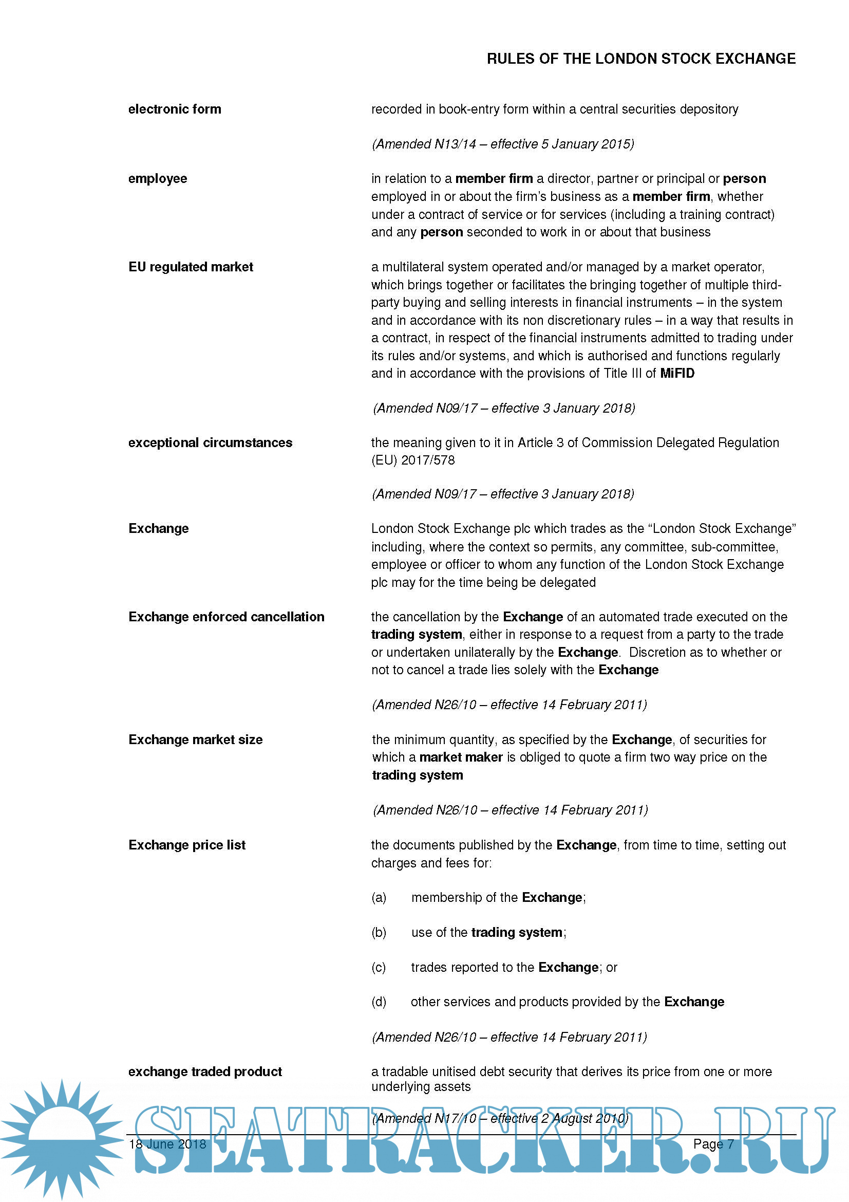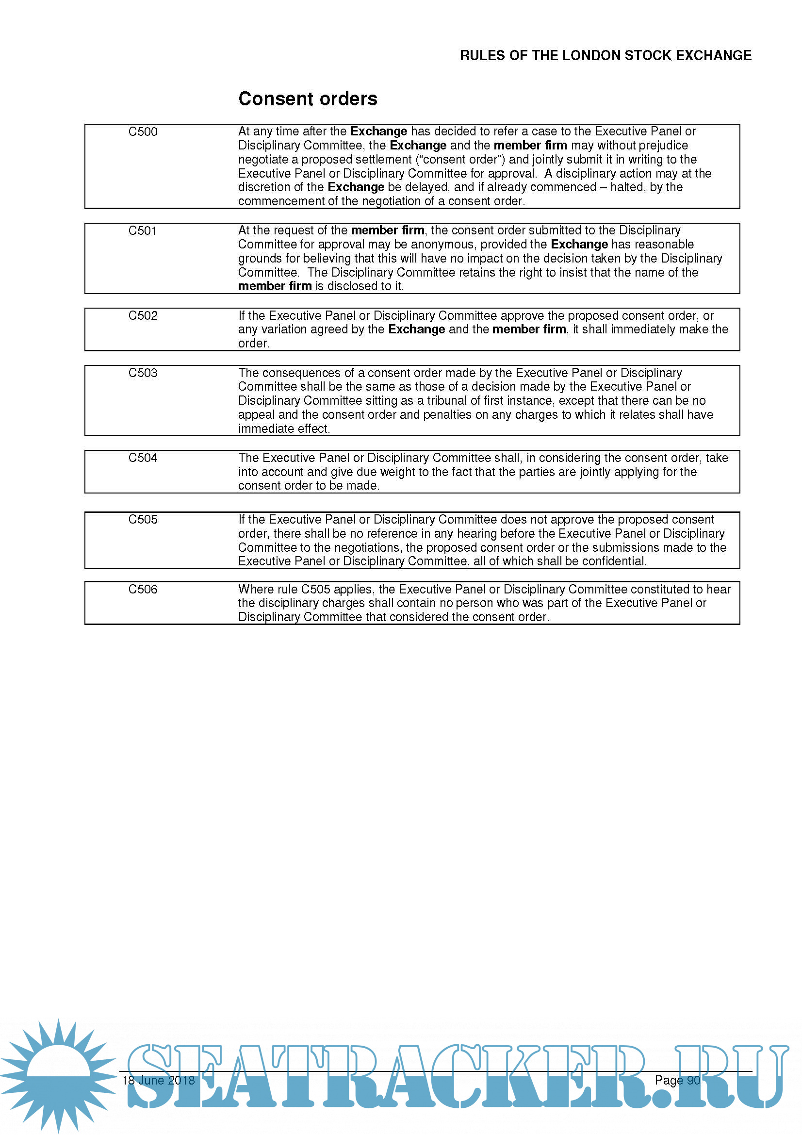 Year: 2018 Language: english Author: London Stock Exchange Genre: Convention (rules) Format: PDF Quality: eBook Pages count: 99 Description: Reference to any statute and statutory provision shall be construed as those in force from time to time. References to time shall mean the time in London unless stated otherwise. References to days are business days unless otherwise stated. Chapter headings, section headings and the titles and numbers of rules are for guidance and ease of reference only. For the purpose of these rules, an act or course of conduct includes both acts and omissions. Terms in bold are defined terms and shall have the meanings set out in the Definitions unless the context otherwise requires, and cognate expressions shall be construed consistently with them. Rules with supplementary guidance are flagged with the notation “G” with the relevant guidance located immediately after the rule. A breach of the guidance is evidence of a breach of the rule. A breach of the Rules would be subject to the disciplinary processes currently in place. These rules shall be construed in accordance with, and governed by, the laws of England and Wales. The Exchange shall not be liable in damages for anything done or omitted in the discharge of these rules unless it is shown that the act or omission was done in bad faith.