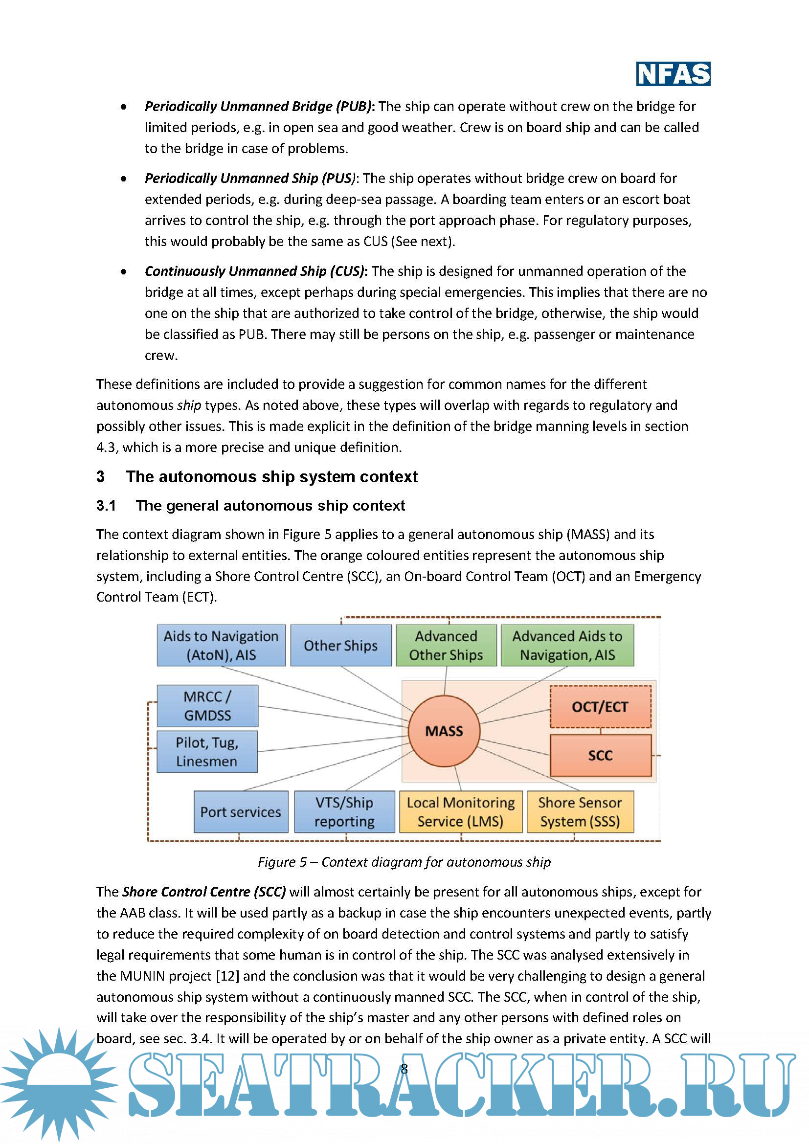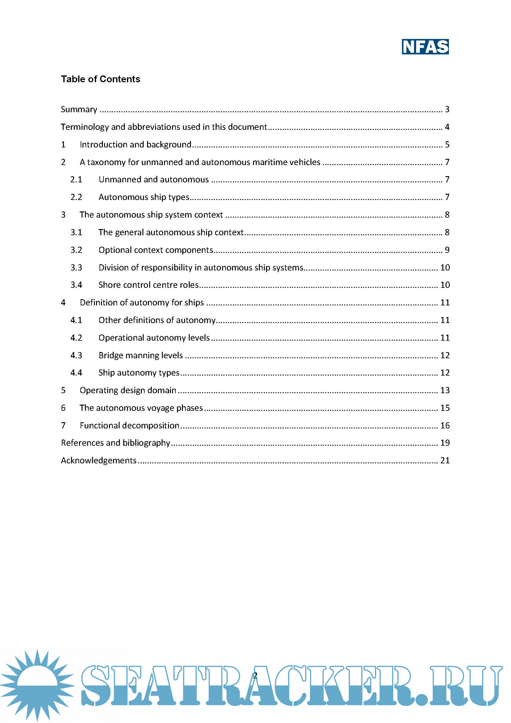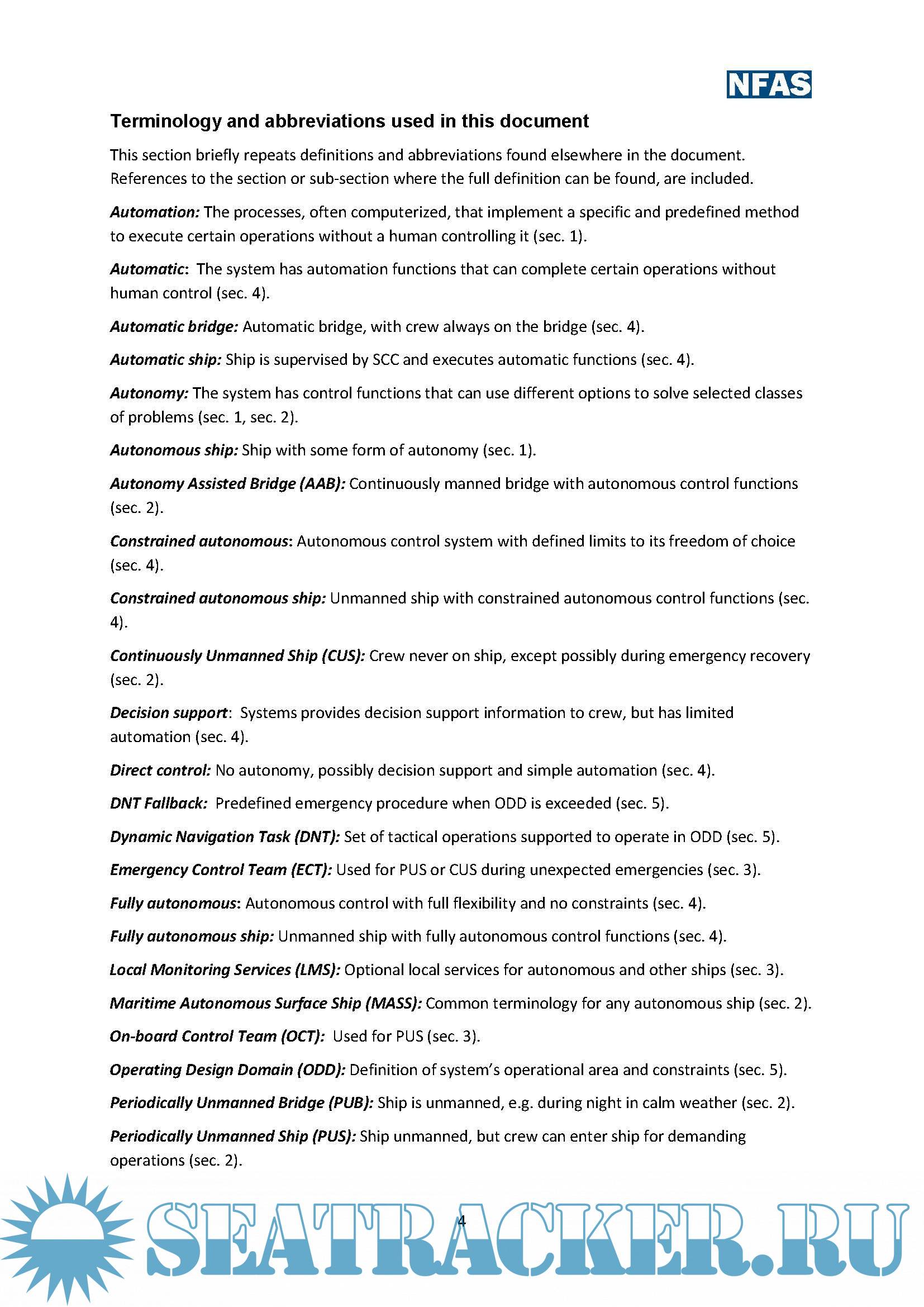 Year: 2017 Language: english Author: NFAS Genre: Reference book Format: PDF Quality: eBook Pages count: 22 Description: This document contains definitions that are relevant when describing what an autonomous ship is, the context it operates in and the functions it needs to implement to operate safely. Section 1 gives a brief introduction, some high-level definitions and explains the relationships between the groups of definitions. Section 2 defines the different autonomous ship types. Section 3 defines the ship’s support systems and its general operational context. Section 4 defines automation levels and autonomy types as a function of automation level and bridge manning level. Section 5 defines the Operational Design Domain (ODD) and corresponding terminology to specify what the ship can and cannot do and how fall-back procedures are used to handle situations outside the operational domain. Section 6 briefly discusses the use of different autonomy types on the same ship during a voyage. Section 7 gives a functional breakdown of the ship that can be used as basis for describing the ODD or for doing hazard identification. A final section provides acknowledgements.