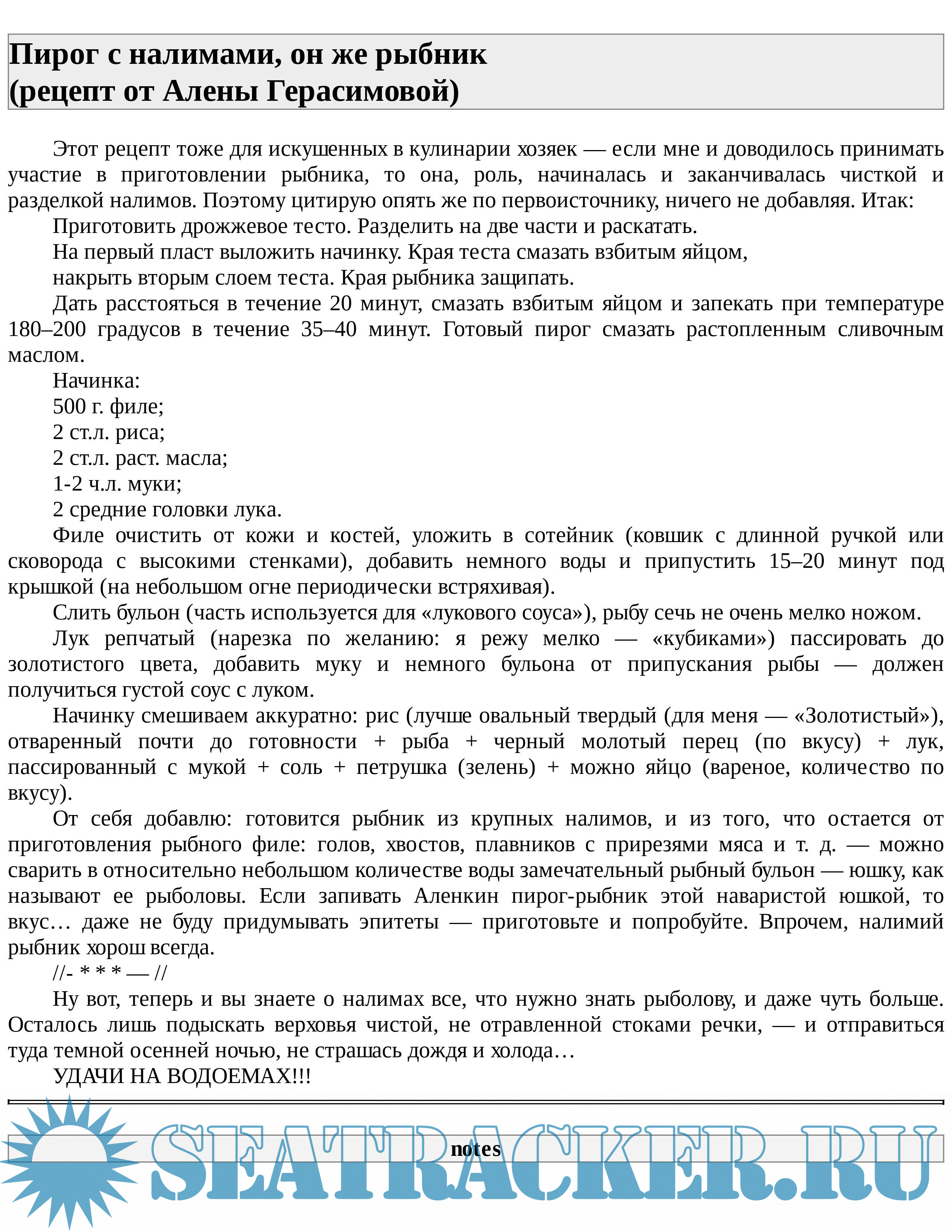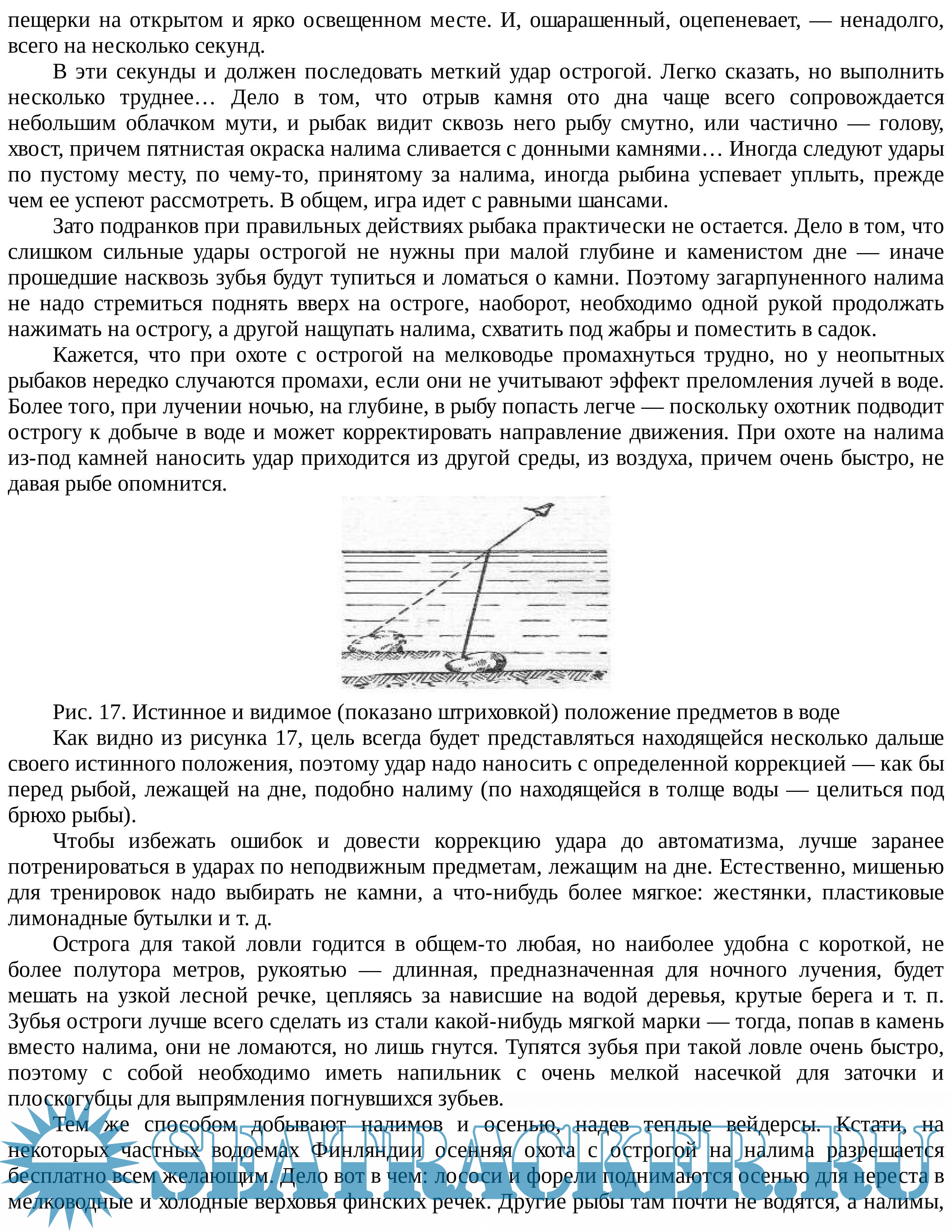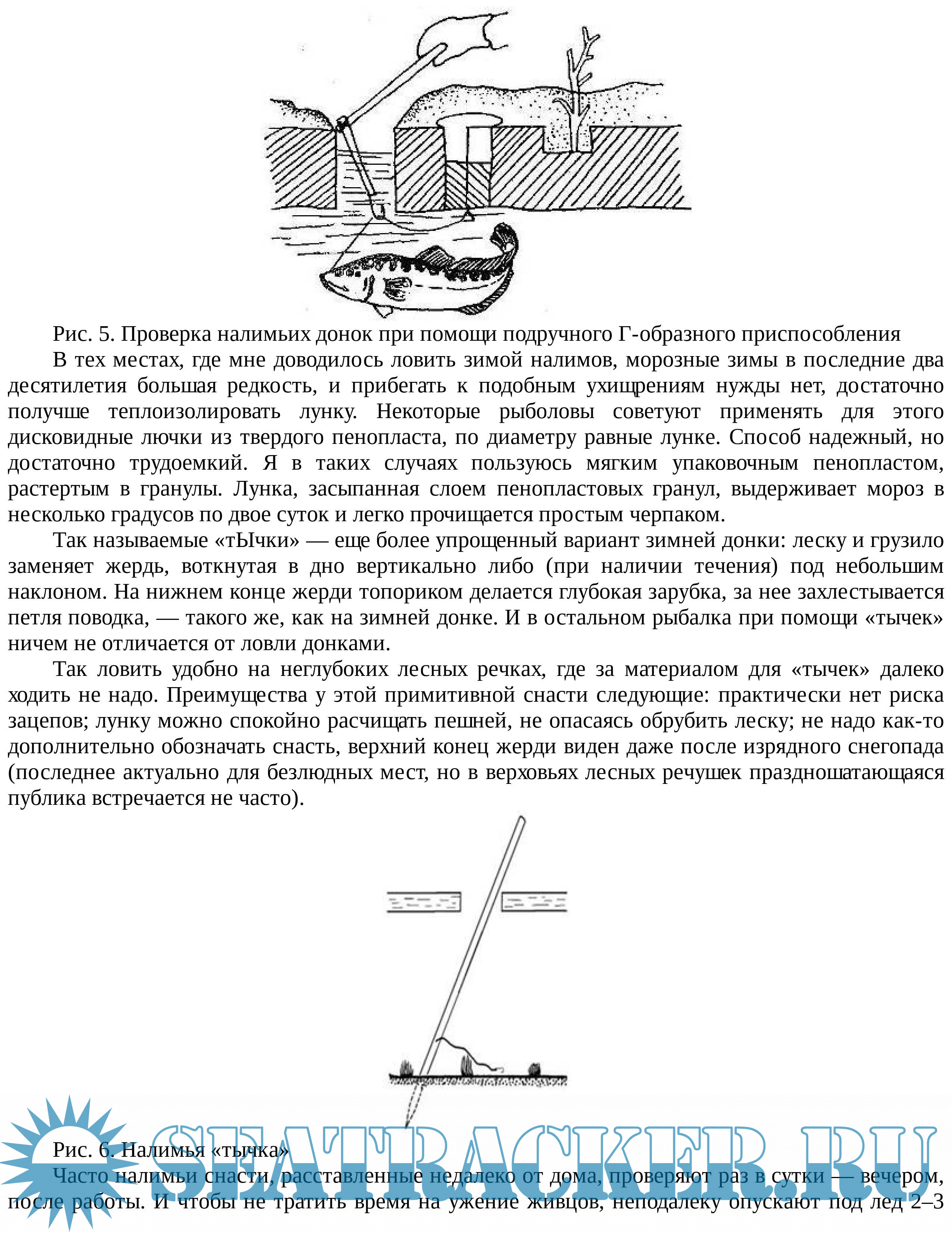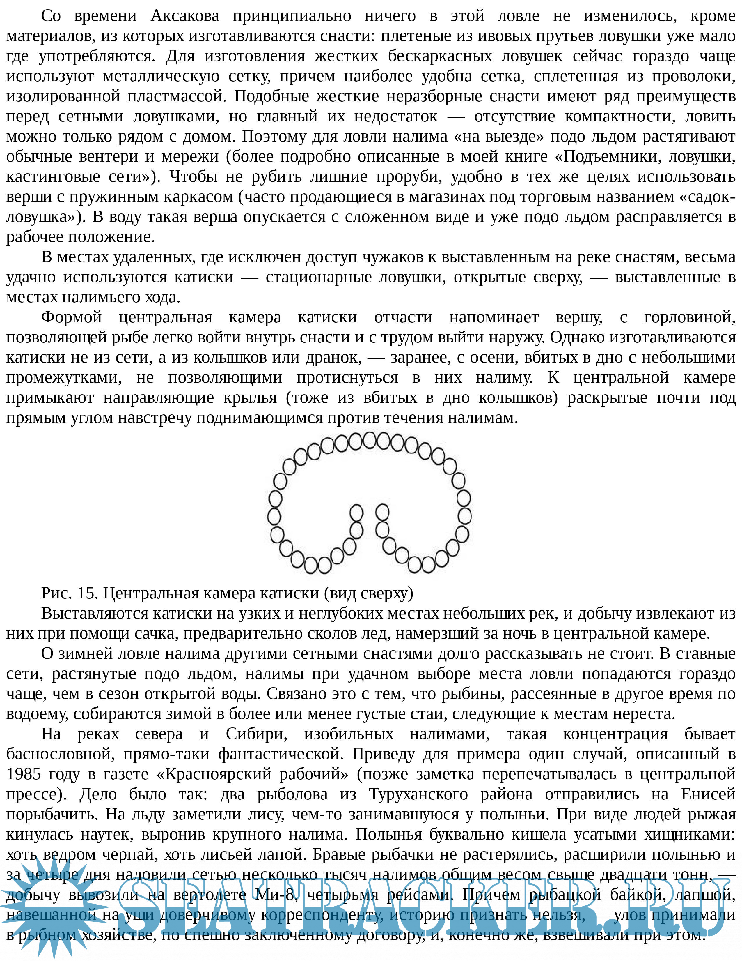 Наряду с известными удочками, донками и подпусками описаны применяемые для ловли налима сетные и другие рыболовные орудия, не относящиеся к спортивным. Способы и снасти, разрешенные или разрешенные с ограничениями современным законодательством, описаны подробно, безусловно запрещенные — кратко, в качестве исторического экскурса.