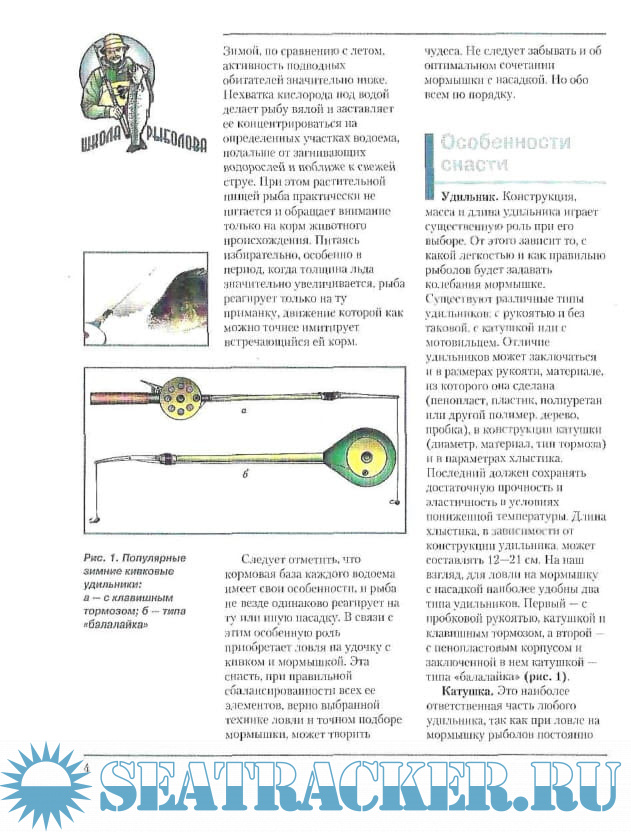 Описание: Из года в год растет число любителей подледного лова. Свободно передвигаясь по льду, можно легко добраться до самых потаенных уголков водоема. Наиболее быстро находить рыбьи тропы позволяет зимняя удочка с кивком и мормышкой. Игра приманки и распространяемые ею колебания привлекают рыбу издалека, а мобильность снасти дает возможность использовать метод активного поиска.