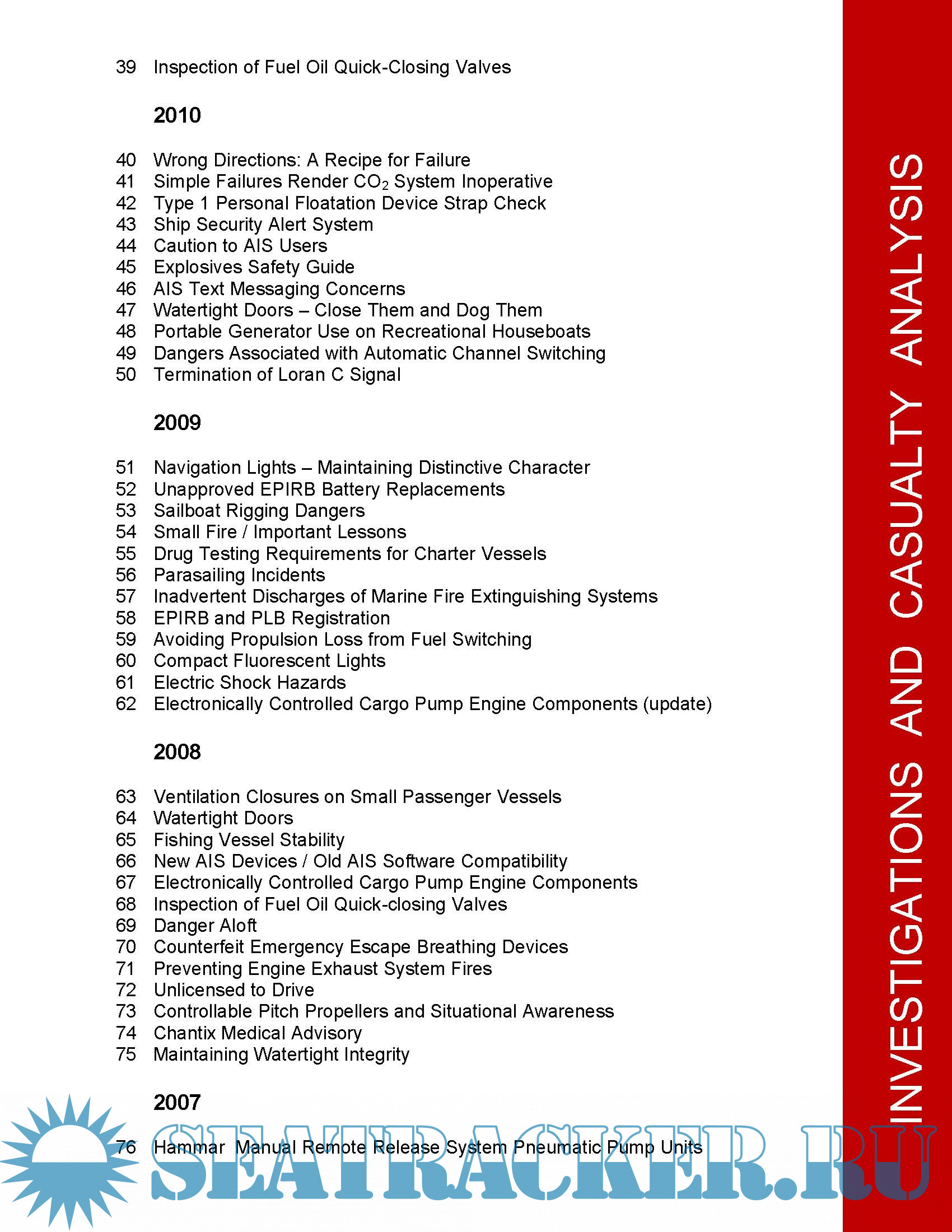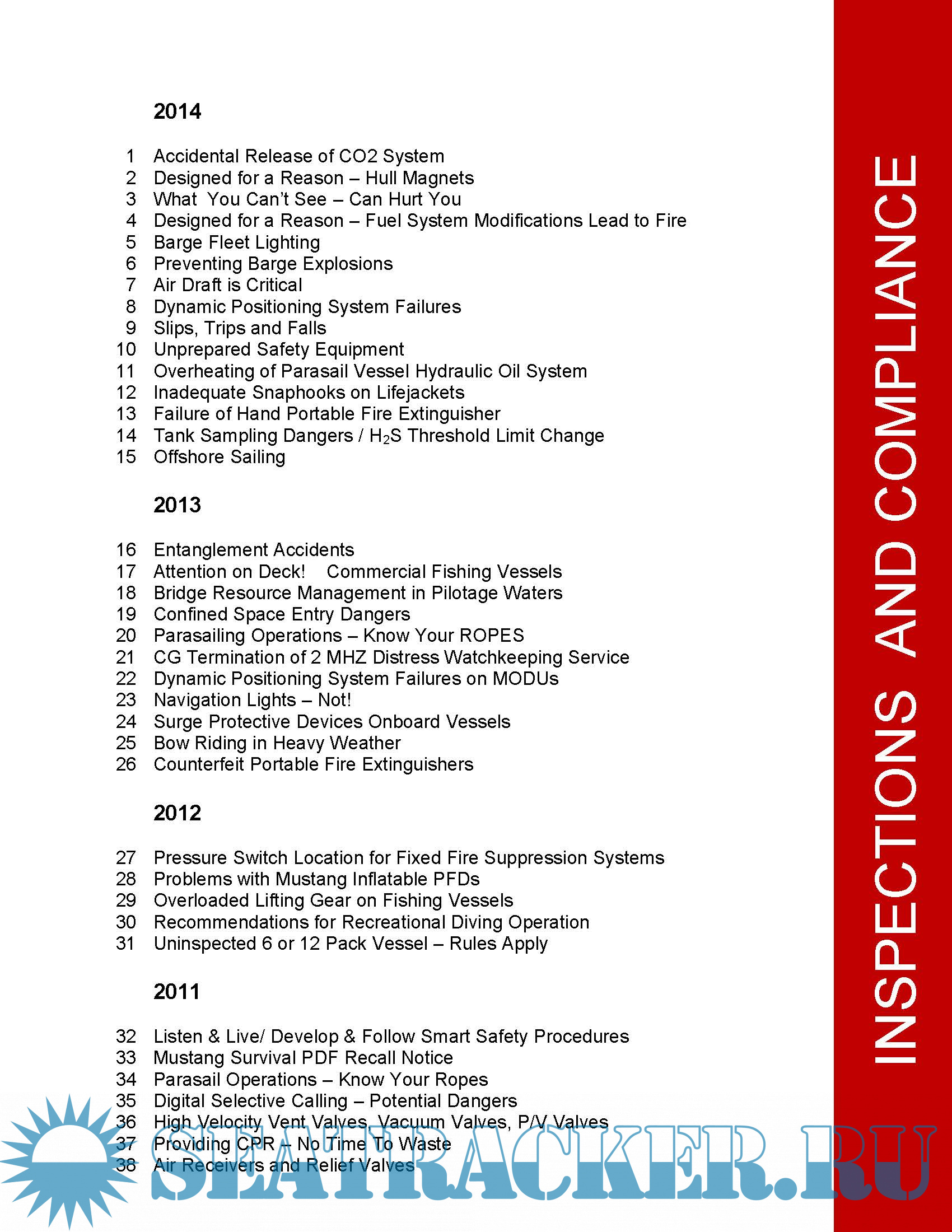 Year: 2015 Language: english Author: USCG Genre: Other Format: PDF Quality: eBook Pages count: 233 Description: This download contains Safety Alerts & Lessons Learned as released by U.S. Coast Guard Prevention in 2015, namely Safety Alerts 1996-2014 . For a complete list refer to contents.