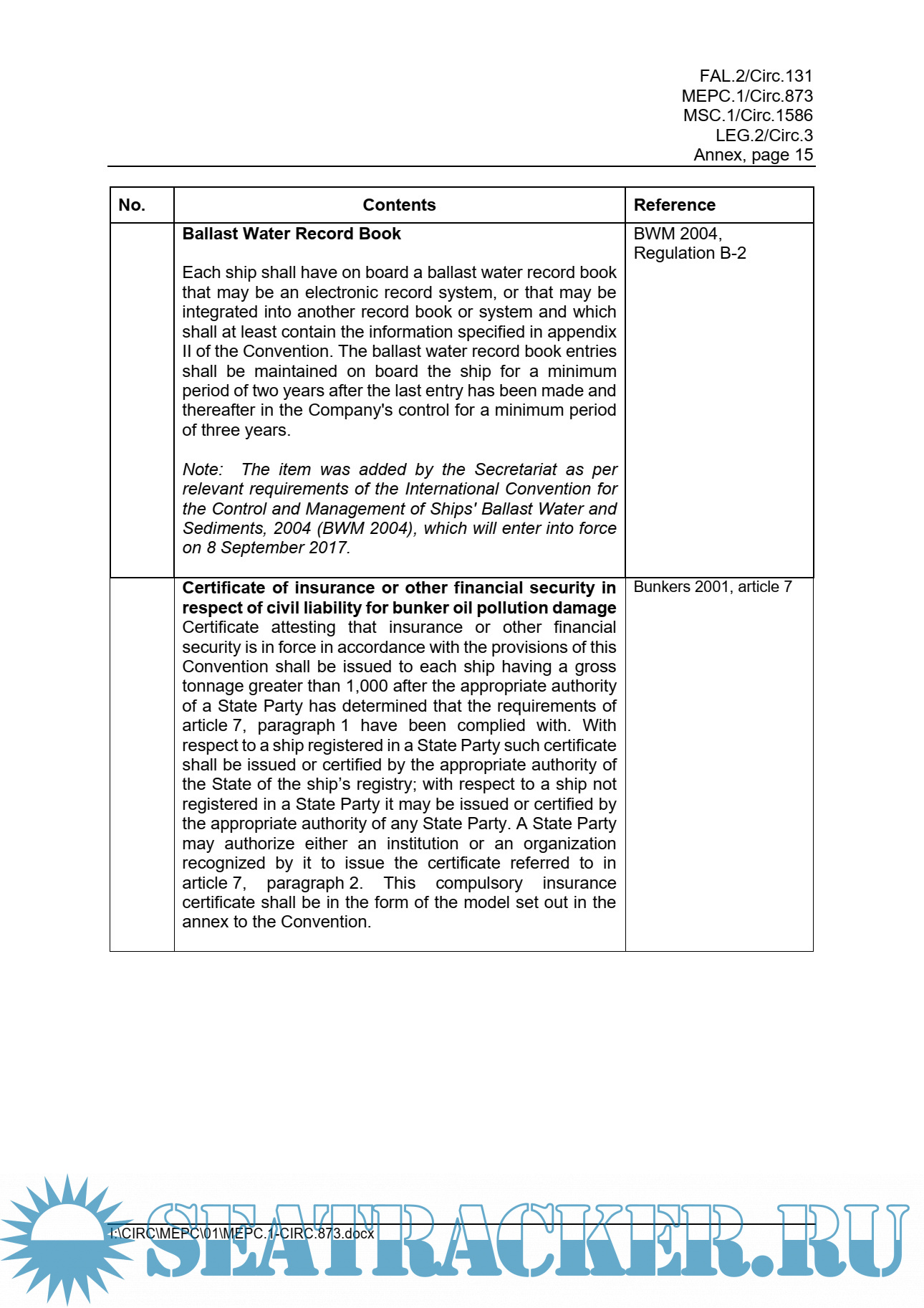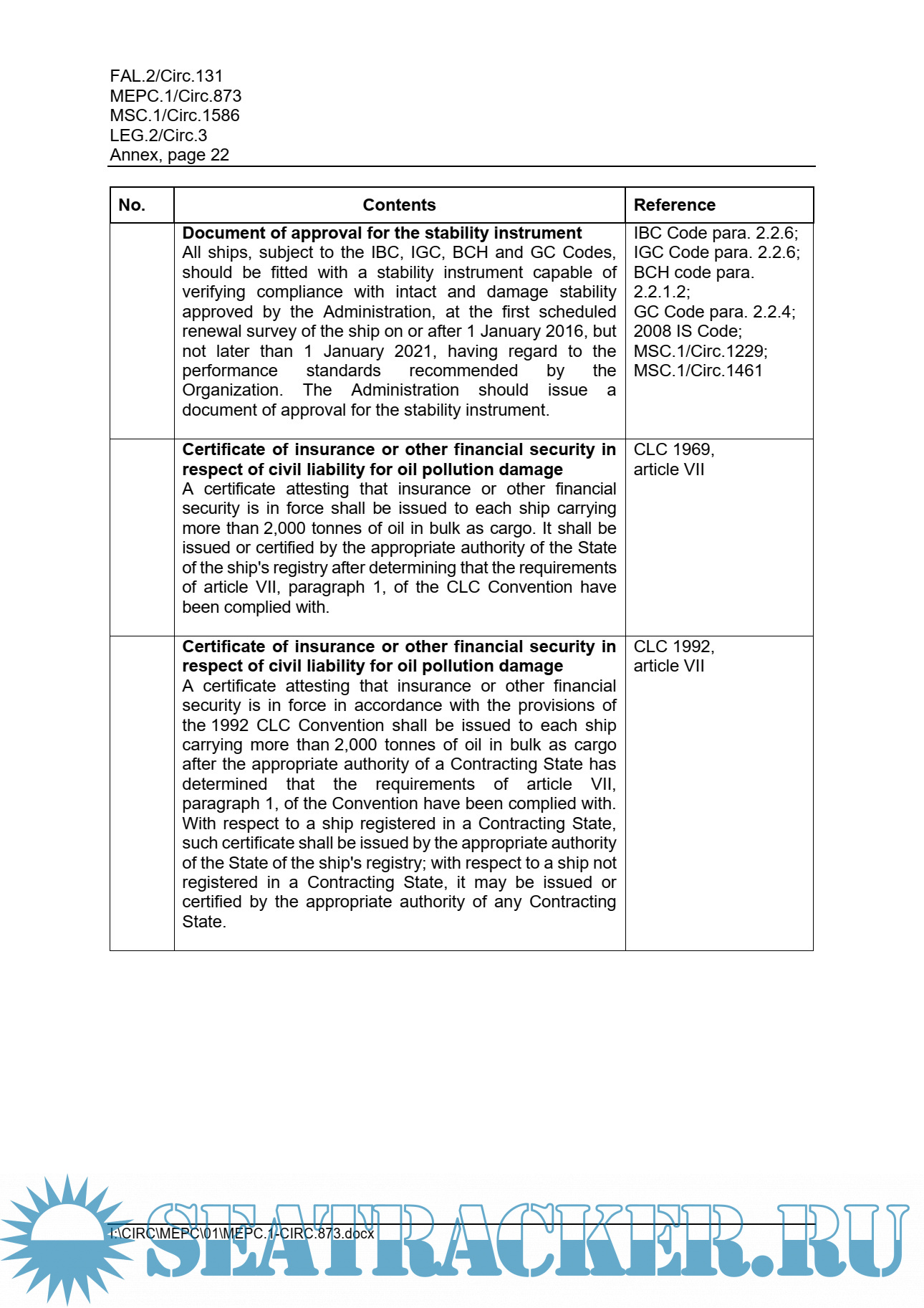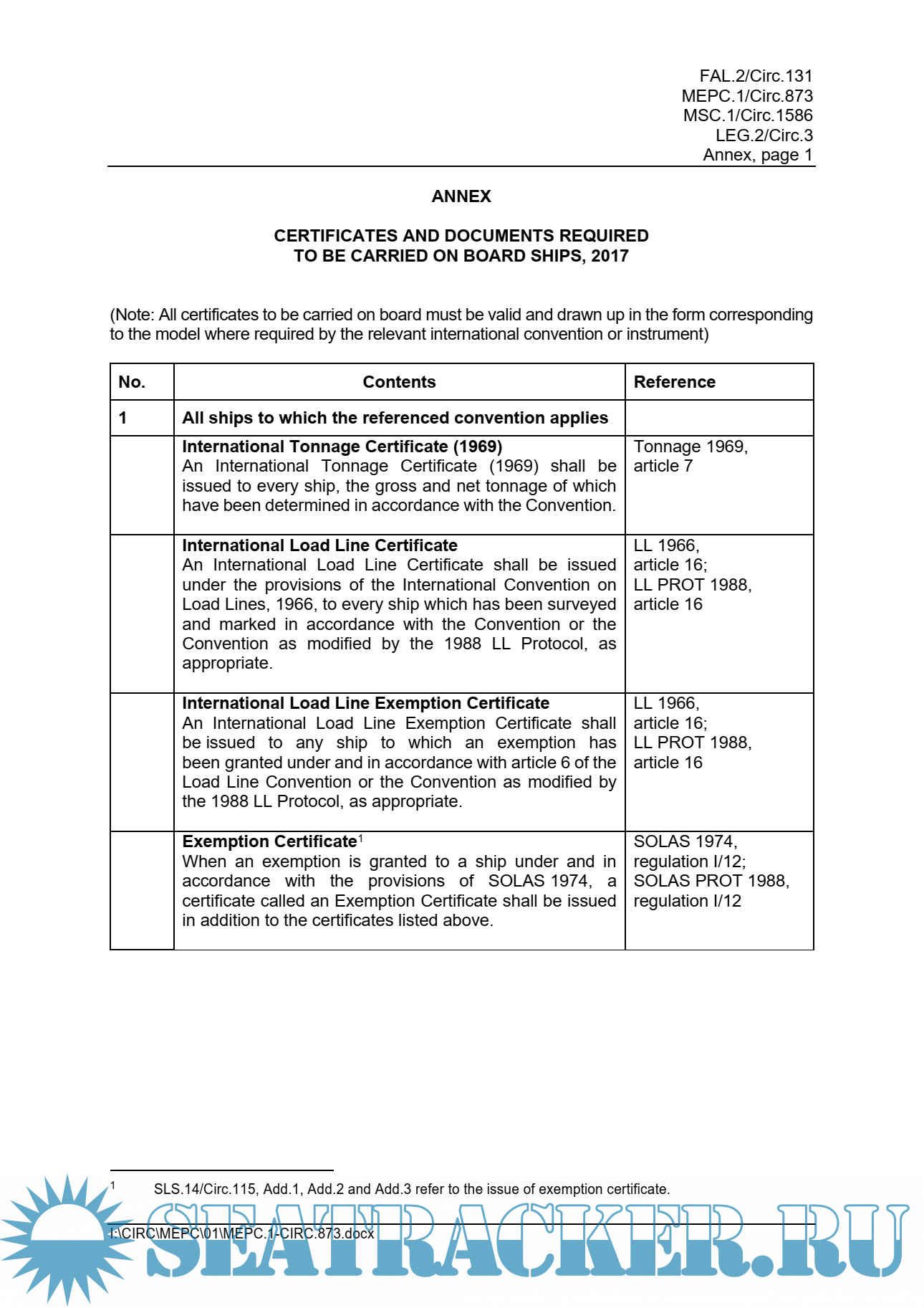 Description: This circular lists only the certificates and documents that are required under IMO instruments and it does not include certificates or documents required by other international organizations or governmental authorities