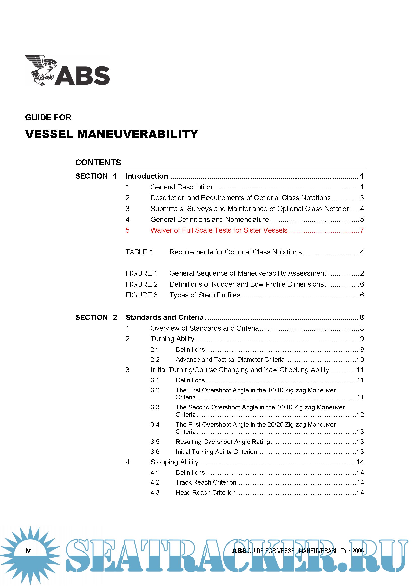 Year: 2006 Language: english Author: American Bureau of Shipping (ABS) Genre: Guide Publisher: ABS Format: PDF Quality: OCR without errors Pages count: 111 Description: This Guide is intended to assist users in applying IMO maneuvering standards and to allow the Owner, designer and builder to rate the vessel’s maneuvering performance relative to statistical data of vessel maneuvering characteristics. The Guide summarizes the procedures to be used in assessing a vessel’s maneuvering performance.