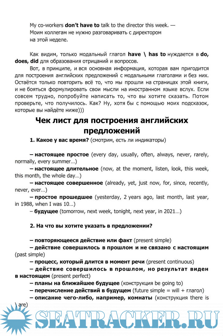 Год выпуска: 2016 Язык: Русский, Английский Автор: Карина Гальченко Жанр: Учебное пособие Издательство: Ridero ISBN: 978-5-4483-1991-4 Формат: PDF+FB2 Качество: Изначально компьютерное (eBook) Количество страниц: 180(PDF) +380(FB2) Описание: Книга идеальна для читателей с уровнем beginner/elementary. Автор поможет разобраться с базовыми временами, используя нестандартные и одновременно простые объяснения. Пособие можно использовать как для самостоятельного изучения английского, так и для занятий с репетитором. Вы сможете отслеживать свои успехи в освоении той или иной темы благодаря наличию ключей ко всем практическим упражнениям. Вы, наконец, разберётесь, как устроен английский язык, и начнёте правильно формулировать свои мысли.