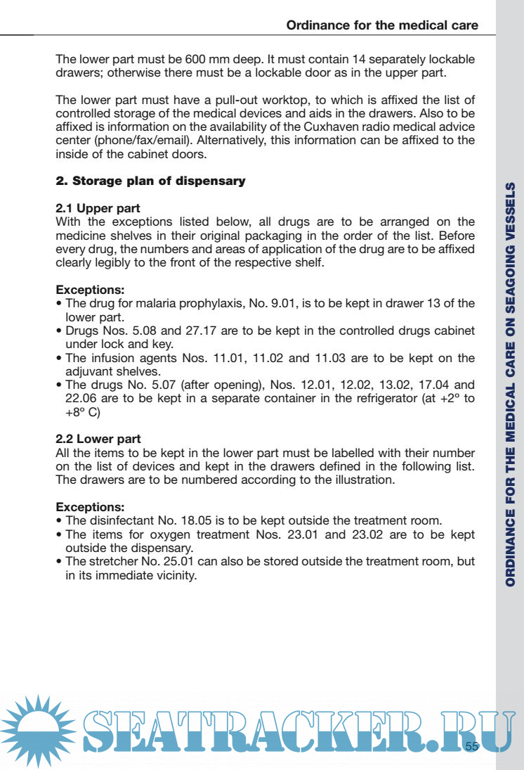 Year: 2010 Language: english Author: BGBI Genre: Convention (rules) Format: PDF Quality: eBook Pages count: 56 Description: Merchant vessels flying the German flag and their lifeboats, rescue boats, inflatable liferafts and inflatable boats approved for use as lifeboats shall be equipped with medicines, medical devices and other aids for the care of the sick in compliance with the regulations of this Ordinance and its appendices. Additional info: It is very often, that ships under German management initially was registered under German flag & law, and later have been shifted to any other flags (A&B, Cyprus e.t.c). Those ships have Officially authorized Certificate, stated possibility to fly temporary flag of other country instead of German. That means that owners keep possibility to fly German flag on short notice. That is why, that even with foreign flag, those ships need to comply with german medical standards as well. Such standards given in this Ordinance.