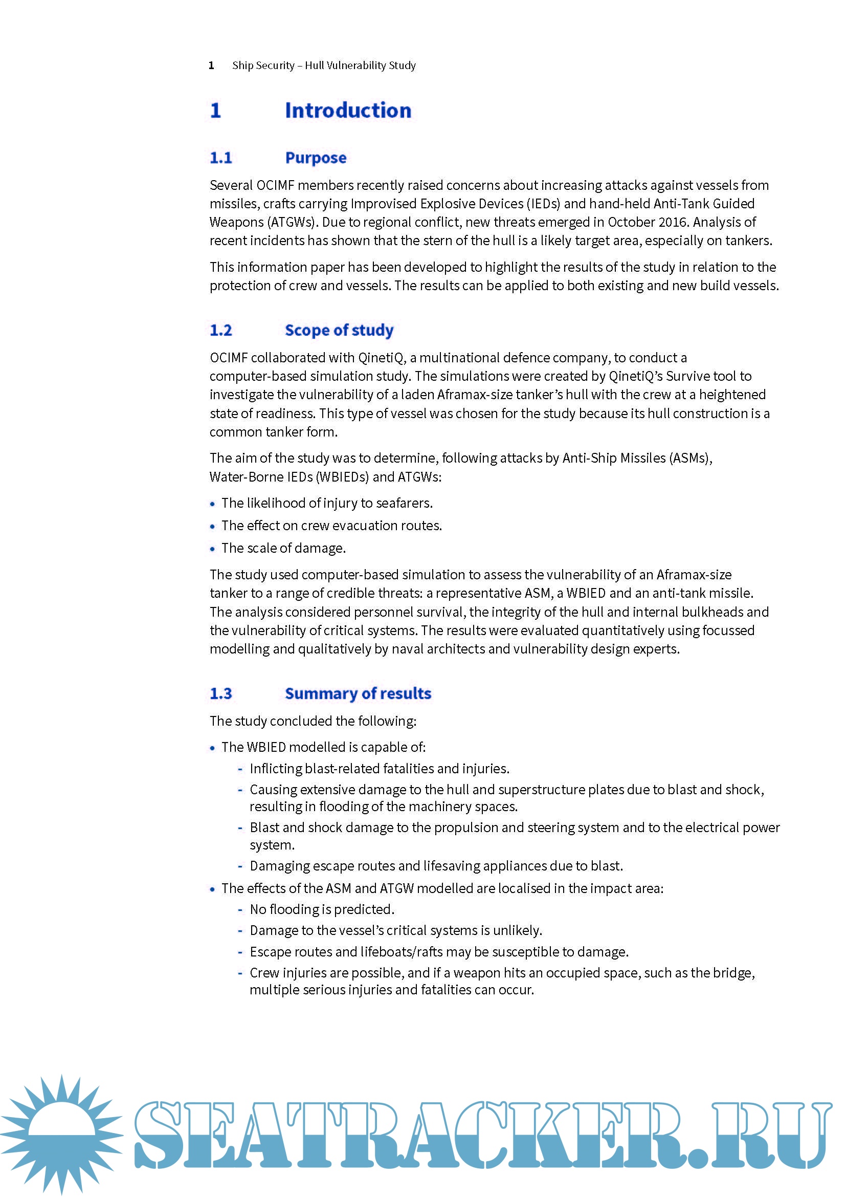 Year: 2019 Language: english Author: OCIMF Genre: Research papers Format: PDF Quality: eBook Pages count: 18 Description: Several OCIMF members recently raised concerns about increasing attacks against vessels from missiles, crafts carrying Improvised Explosive Devices (IEDs) and hand-held Anti-Tank Guided Weapons (ATGWs). Due to regional conflict, new threats emerged in October 2016. Analysis of recent incidents has shown that the stern of the hull is a likely target area, especially on tankers. This information paper has been developed to highlight the results of the study in relation to the protection of crew and vessels. The results can be applied to both existing and new build vessels. OCIMF collaborated with QinetiQ, a multinational defence company, to conduct a computer-based simulation study. The simulations were created by QinetiQ’s Survive tool to investigate the vulnerability of a laden Aframax-size tanker’s hull with the crew at a heightened state of readiness. This type of vessel was chosen for the study because its hull construction is a common tanker form.