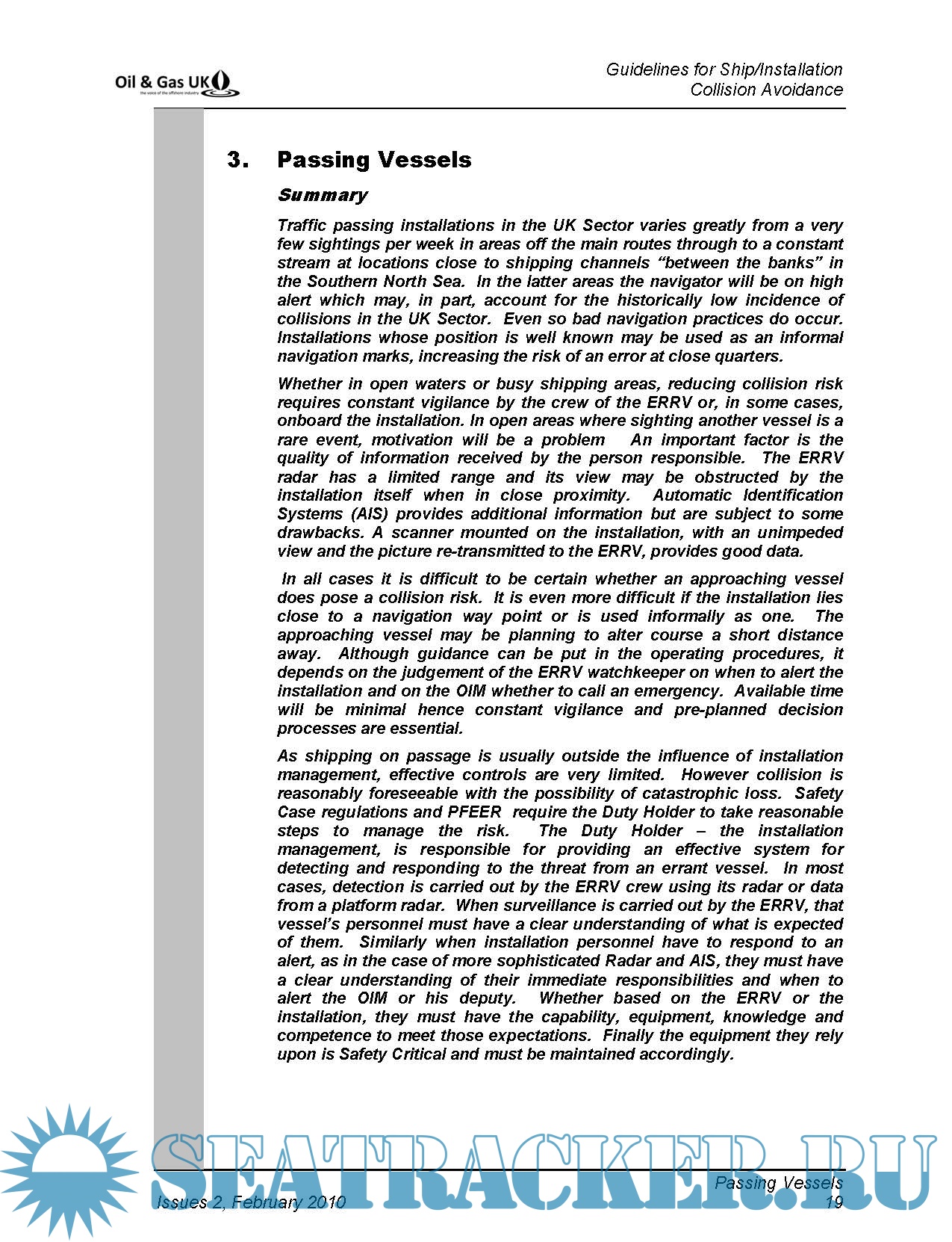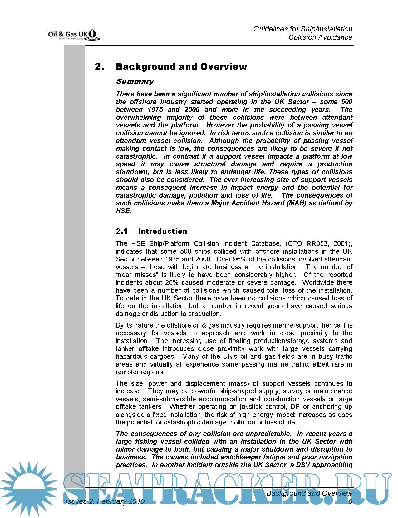 Year: 2010 Language: english Author: Oil & Gas UK Genre: Guide Publisher: Oil & Gas UK ISBN: 1 903 003 62 8 Format: PDF Quality: eBook Pages count: 83 Description: This document focuses on the reducing the risk of ship-installation collisions. Consequences are only considered insofar as they dictate timely appropriate response to imminent or actual impact. It gives guidance on good practice and suggests benchmarks against which to assess compliance. ALARP principles apply. Although procedures and equipment are suggested it is recognised that suitable alternatives for the situation of a particular field or installation may be acceptable. The document emphasises that equipment to achieve effective collision avoidance is safety critical and should be maintained as such. For the purposes of this document various vessel types are considered separately: passing vessels - those on route to somewhere else; attendant vessels - that is vessels with legitimate business at the installation; offtake tankers - a subset of attendant vessels, which interact with the installation in a specialised way and are therefore addressed in a dedicated section. Recommendations made in this guidance rely principally on checklists covering management systems, vessel suitability, self-audit and pre-operational checks – a form of risk assessment. They draw, wherever possible, on existing proven industry standards. The guidance is aimed principally at operations in the UK Sector, and hence refers to UK legislation, practices and organisations. Other administrations and national associations may wish to use its principles in their own Sectors.