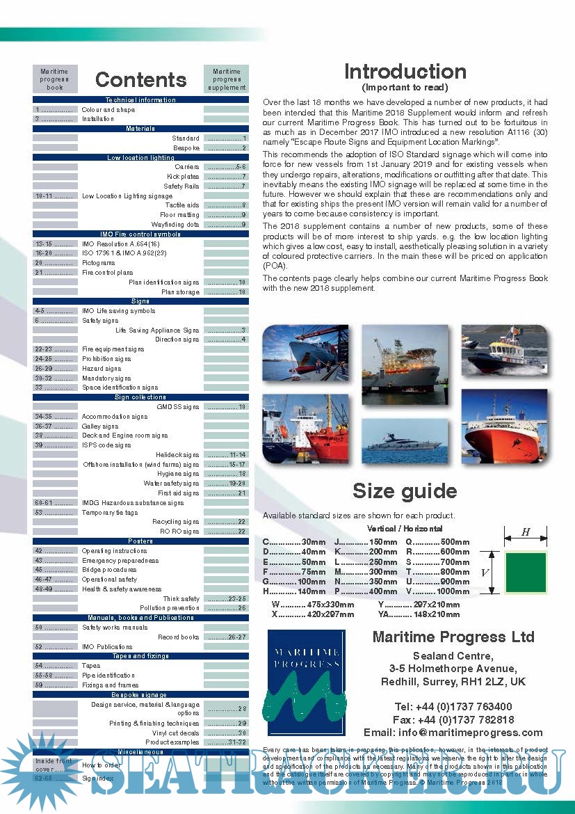 Year: 2018 Language: english Author: Maritime Progress Ltd. [UK] Genre: Handbook Publisher: Maritime Progress Ltd. [UK] Format: PDF Quality: eBook Pages count: 36 Description: This supplement would inform and refresh the current Maritime Progress Book (2013). This has turned out to be fortuitous in as much as in December 2017 IMO introduced a new resolution A1116 (30) namely “Escape Route Signs and Equipment Location Markings”. The 2018 supplement contains a number of new products, some of these products will be of more interest to ship yards. e.g. the low location lighting which gives a low cost, easy to install, aesthetically pleasing solution in a variety of coloured protective carriers. In the main these will be priced on application (POA). The contents page clearly helps combine the current Maritime Progress Book (2013) with the new 2018 supplement.