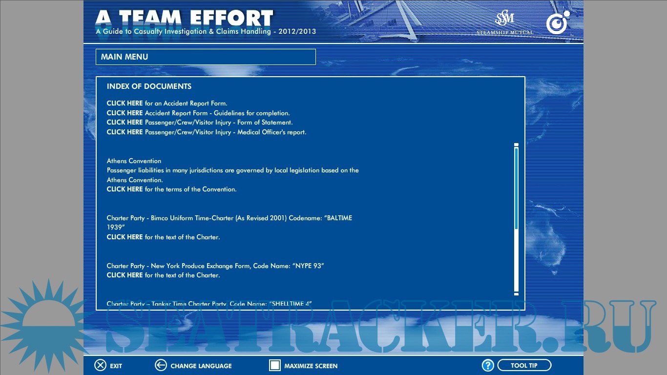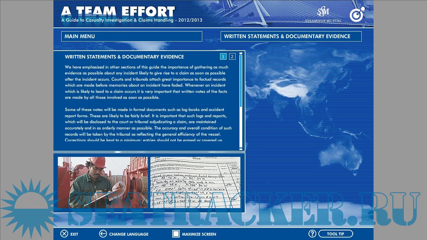 Year: 2012 Localization: russian / english Developer: Steamship Mutual Genre: Education Format: ISO System Requirements: Windows XP & Up Crack: Not needed Description: Accidents will happen - but most accidents are avoidable. Those which give rise to P&I claims are mostly caused by human error, ranging from a momentary lack of attention to a long build-up of poor operating procedures.No doubt you as the user of this DVD are well aware of the importance of the high standards of practice and vigilance needed to avoid claims, and of the operational benefits of so doing. However, in spite of your and others' best efforts, the likelihood is that you will be involved in the aftermath of a claim at some point in the future. In the same way that claims avoidance benefits your organization so following the correct procedures in reacting to incidents and dealing with claims when they arise can greatly reduce the ultimate impact of those claims. To get the best results Club and Member needs to work closely together as the principal players in the claims handling team from the time of the incident until the resolution of the claim. This DVD is designed to help you to play your part in that process.-Происшеcтвия время от времени случаются, но большую часть происшеcтвий можно избежать. Случаи, ведущие к искам, чаще всего происходят по таким причинам, как человеческие ошибки, потеря внимания и несоблюдение установленных процедур. к пользователь данным DVD прекрасно знаете, что для избежания претензий необходимо поддерживать высокие производственные стандарты и проявлять бдительность, что в конечном счёте улучшает качество работы. Однако, несмотря на все старания, имеется вероятность, что в будущем вы будете вынуждены заниматься последствиями иска. Помимо того, что избежание претензий приносит пользу вашей организации, правильное выполнение требуемых процедур после того, как произошел инцидент, и последующее урегулирование исков при их возникновении может значительно уменьшить негативные последствия этих исков. Для достижения наилучших результатов Клуб и Член Клуба должны работать совместно в качестве основных участников группы, занимающейся урегулированием иска, начиная от момента, когда произошел инцидент, и до разрешения иска. Данный DVD поможет вам выполнять вашу роль в этом процессе.