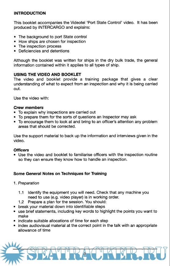 Year: 2000 Language: english Author: INTERCARGO Genre: Training courses Publisher: INTERCARGO Format: PDF Quality: eBook Pages count: 52 Description: This booklet explains: -The background to port State control. -How ships are chosen for inspection. -The inspection process. -Deficiencies and detentions. Although the booklet was written for ships in the dry bulk trade, the general information contained within it applies to all types of ship. Additional info: The Port State Control guide accompanies Videotel's Port State Control video (Not included in this post).