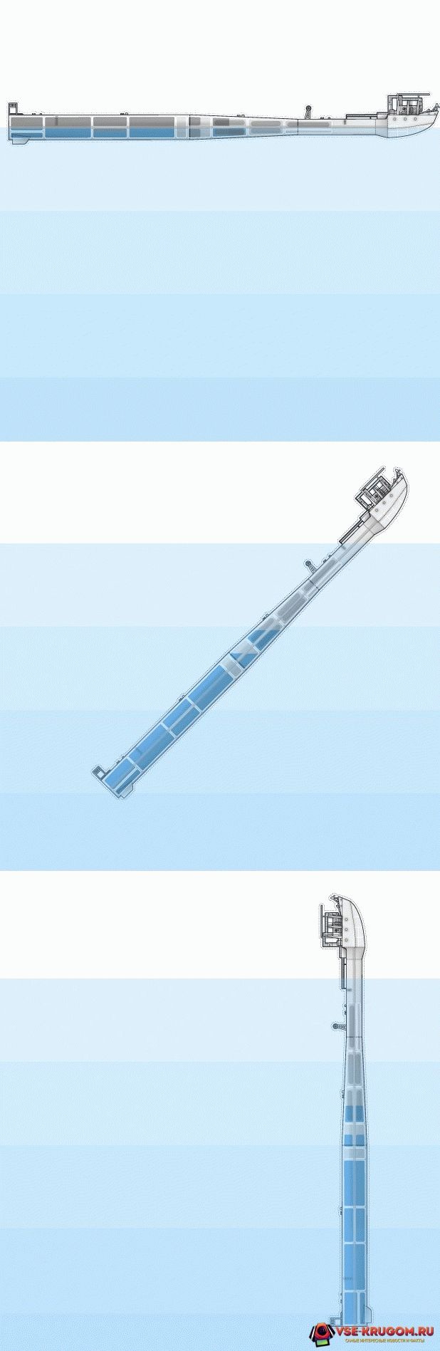 Вы спросите, для чего это нужно? Любой поплавок, а этот корабль превращается именно в поплавок, с легкостью выдержит серьезный шторм, потому что нижняя его часть не подвержена воздействию волн. А после шторма можно достаточно быстро вернуться в горизонтальное положение и продолжить плавание.