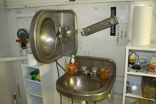 Но что же происходит в каютах, когда судно переворачивается? А в каютах остается все так же уютно. Почти каждый предмет в каюте продублирован в двух плоскостях. Главное: все убрать со столов в специальные шкафчики.