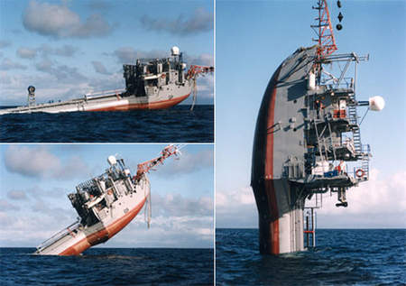 У Америки есть довольно интересная платформа для военных океанологических исследований, которая способна, в прямом смысле слова, переворачиваться. Корабль-перевертыш RP FLIP длинной 108 метров заполняет балластные цистерны водой и плавно переходит в вертикальное положение (переворот на 90 градусов), превращаясь в поплавок. Для того чтобы перевернуть судно требуется 1500 тонн морской воды и 28 минут времени. А над водой остаются всего 17 метров судна.