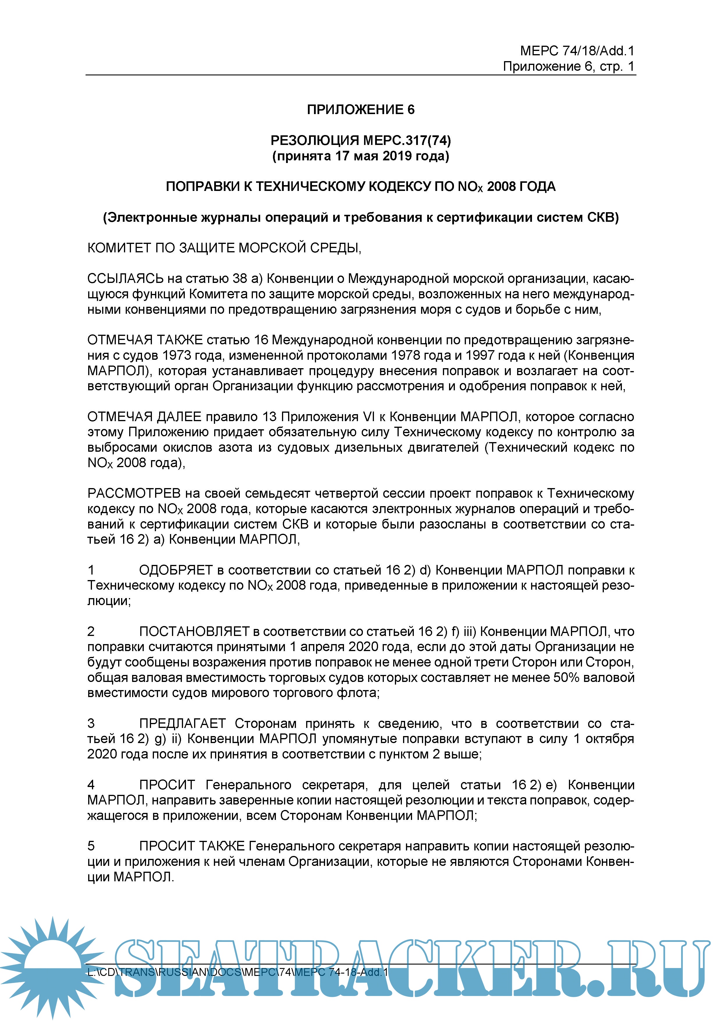 Поправки к Техническому Кодексу по NOx 2008 года (Резолюция MEPC.317(74)) = Amendments to the NOx Technical Code 2008 (Resolution MEPC.317(74))