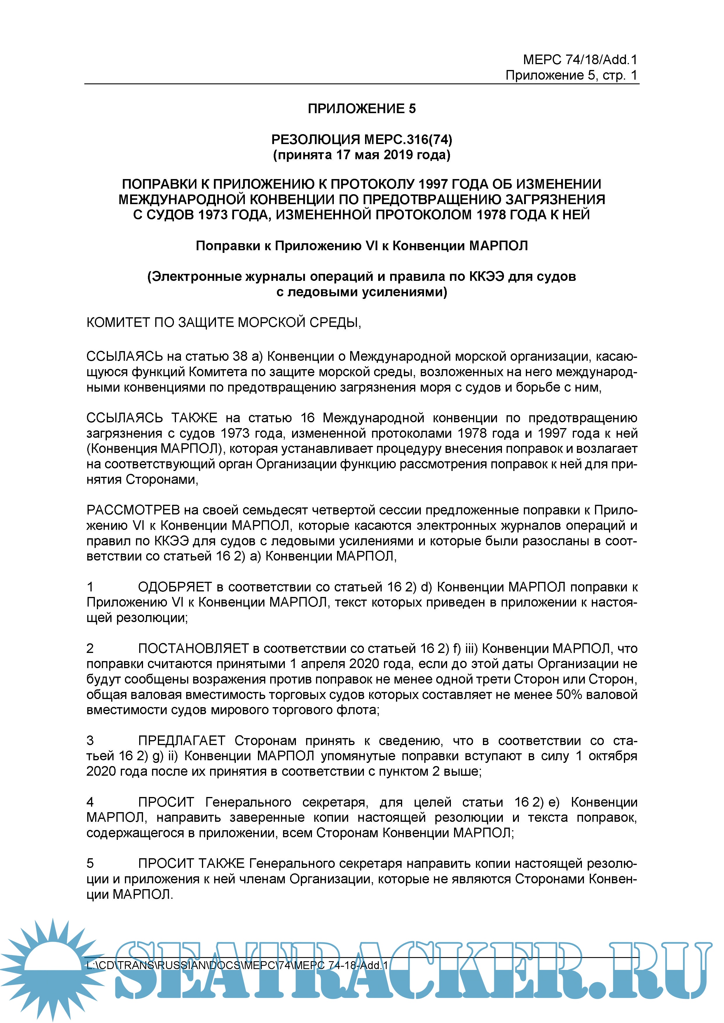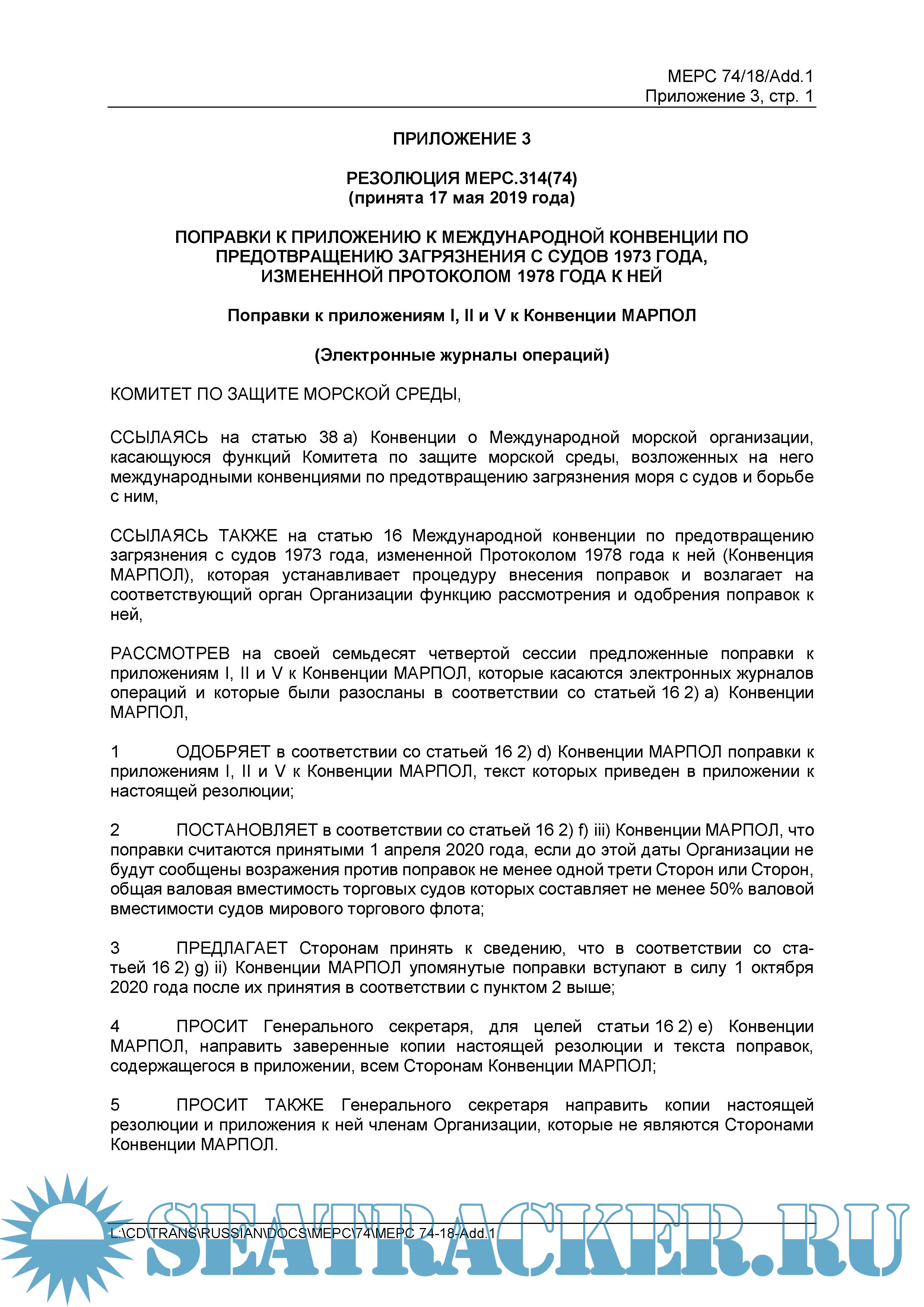 На 74-й сессии Комитета по защите морской среды (MEPC 74) были приняты поправки к Приложениям I, II, V, VI МК МАРПОЛ и Техническому Кодексу по NOx, относящиеся к применению электронных журналов регистрации, которые были одобрены в качестве альтернативы журналам, ведущимся в бумажном виде. Указанные поправки к Приложениям I, II, V, VI к Конвенции МАРПОЛ считаются принятыми с 1 апреля 2020 г. и вступают в силу с 1 октября 2020 г.. КЗМС также принял соответствующее Руководство по использованию электронных журналов операций согласно Конвенции МАРПОЛ (https://seatracker.club/viewtopic.php?t=36651). Английский язык является одним из официальных и, в отличие от русского, рабочим языком ИМО. По этой причине, в случаях каких-либо разночтений, предпочтение должно отдаваться тексту на английском языке (ссылка https://seatracker.club/viewtopic.php?t=37957).
