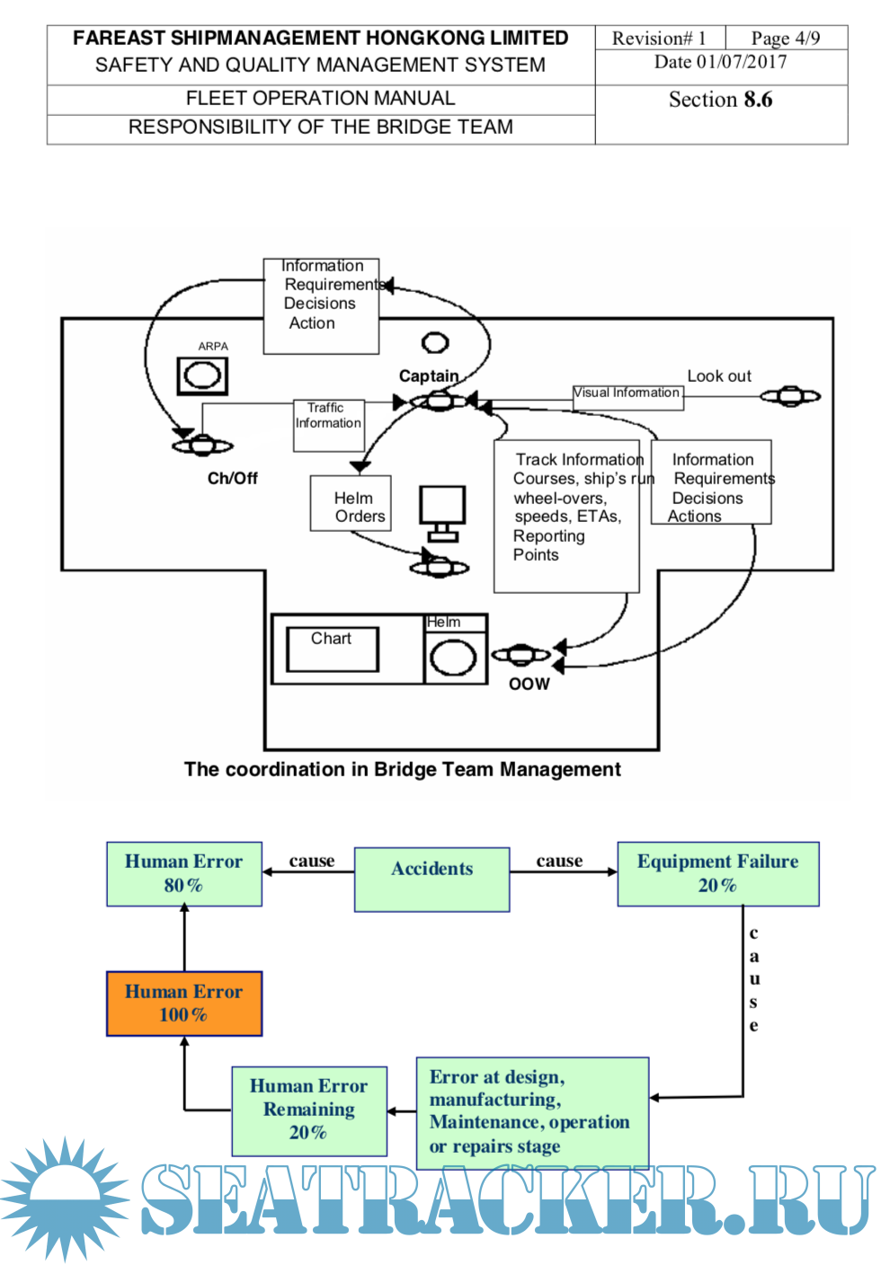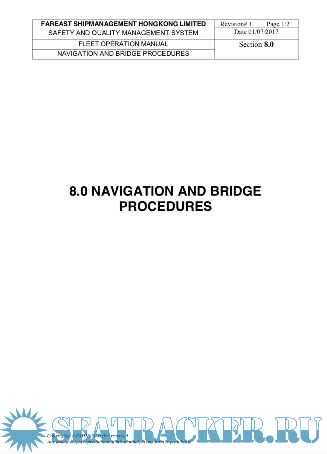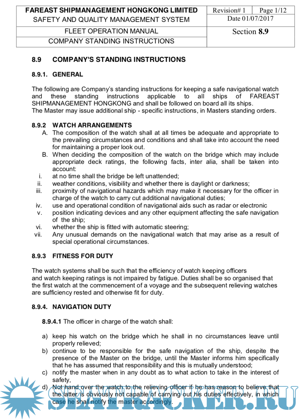 Year: 2017 Language: english Author: Fareast Genre: Methodological guide Publisher: Fareast Edition: 1 ISBN: n/a Format: Other Quality: eBook Pages count: 2017 Description: SEC 8 of SAFETY AND QUALITY MANAGEMENT SYSTEM of Fareast Shipmanagement Hongkong limited. Included risk assesments and check list of all procediments. 8.1GENERAL An efficient bridge organization requires competent and vigilant bridge watch keeping officers and a strong and efficient team, which shall follow specified procedures and is fully familiar with the navigation equipment and its competent use. Analysis of casualties indicates that weakness in the organization coupled with failure of the individuals to carry out their duties" the right way the first time and every time" have contributed to a number of accidents. Navigating activities rarely allow time for taking corrective action at the last moment. All actions therefore need to be pre planned taking into account the relevant passage, associated nautical publications, weather, currents and the manoeuvring ability of the ship. The procedures specified herein are a required minimum by the company. Additional info: PDF, doc and xls