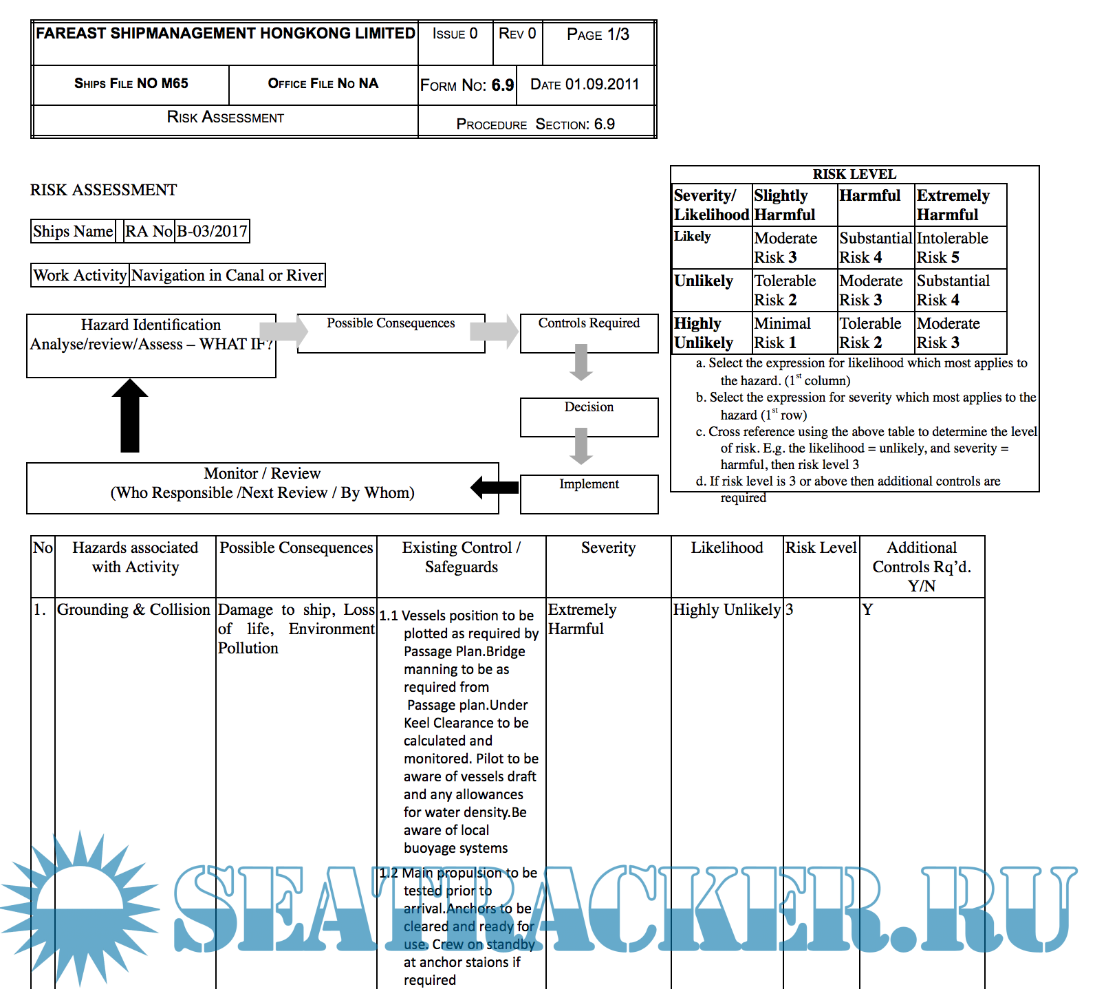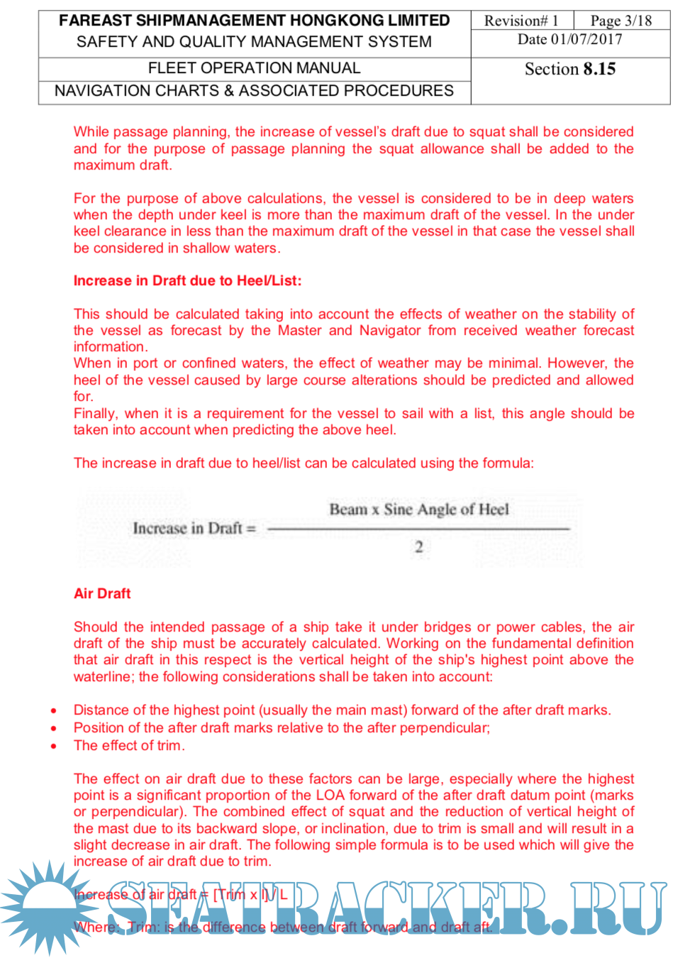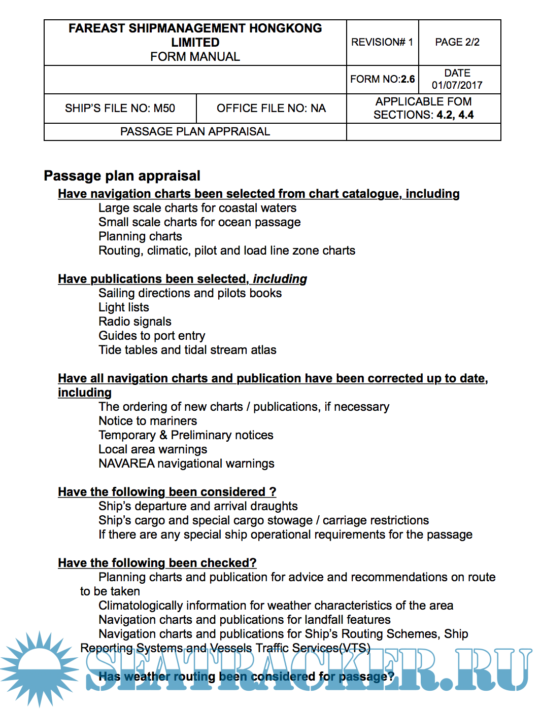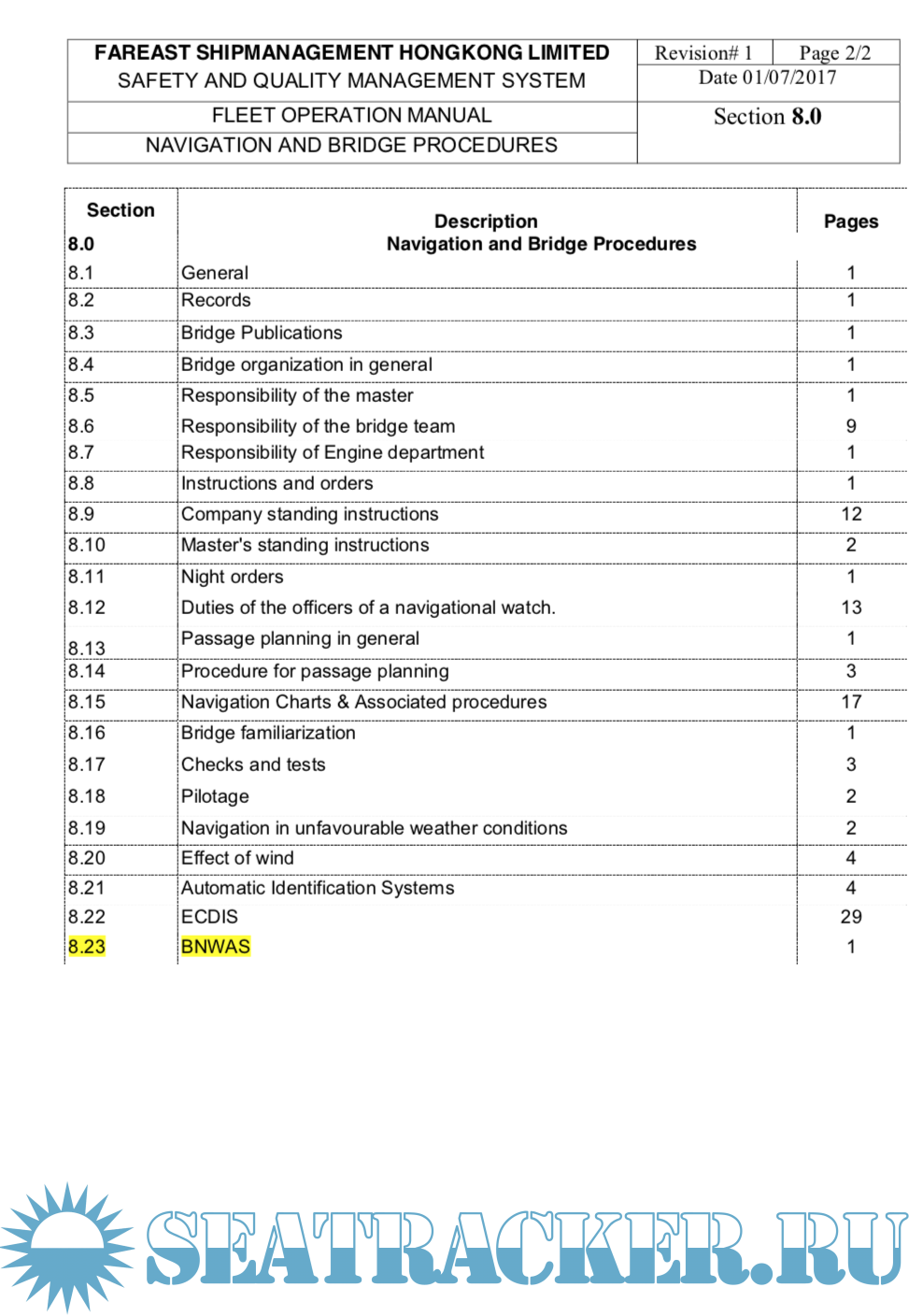 Year: 2017 Language: english Author: Fareast Genre: Methodological guide Publisher: Fareast Edition: 1 ISBN: n/a Format: Other Quality: eBook Pages count: 2017 Description: SEC 8 of SAFETY AND QUALITY MANAGEMENT SYSTEM of Fareast Shipmanagement Hongkong limited. Included risk assesments and check list of all procediments. 8.1GENERAL An efficient bridge organization requires competent and vigilant bridge watch keeping officers and a strong and efficient team, which shall follow specified procedures and is fully familiar with the navigation equipment and its competent use. Analysis of casualties indicates that weakness in the organization coupled with failure of the individuals to carry out their duties" the right way the first time and every time" have contributed to a number of accidents. Navigating activities rarely allow time for taking corrective action at the last moment. All actions therefore need to be pre planned taking into account the relevant passage, associated nautical publications, weather, currents and the manoeuvring ability of the ship. The procedures specified herein are a required minimum by the company. Additional info: PDF, doc and xls