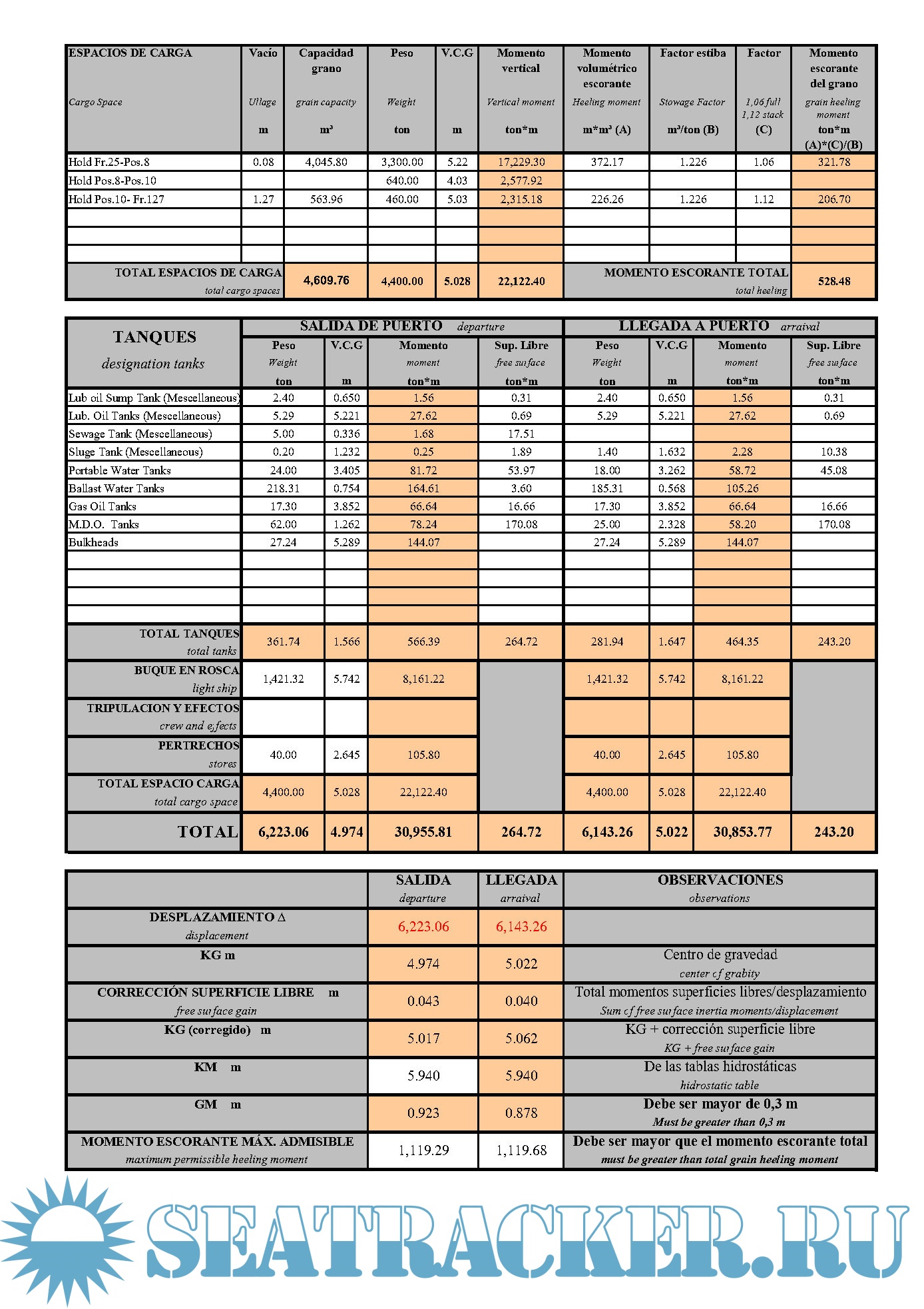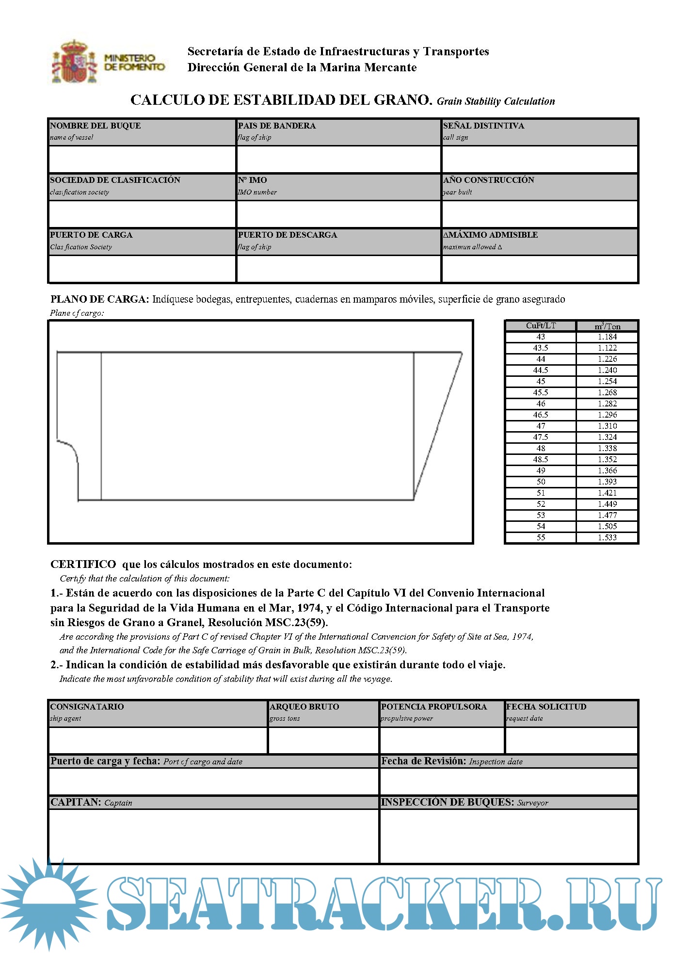 Description: Excel spreadsheet to calculate the grain stability as per Spanish regulations and required by the harbourmaster in Spanish ports.