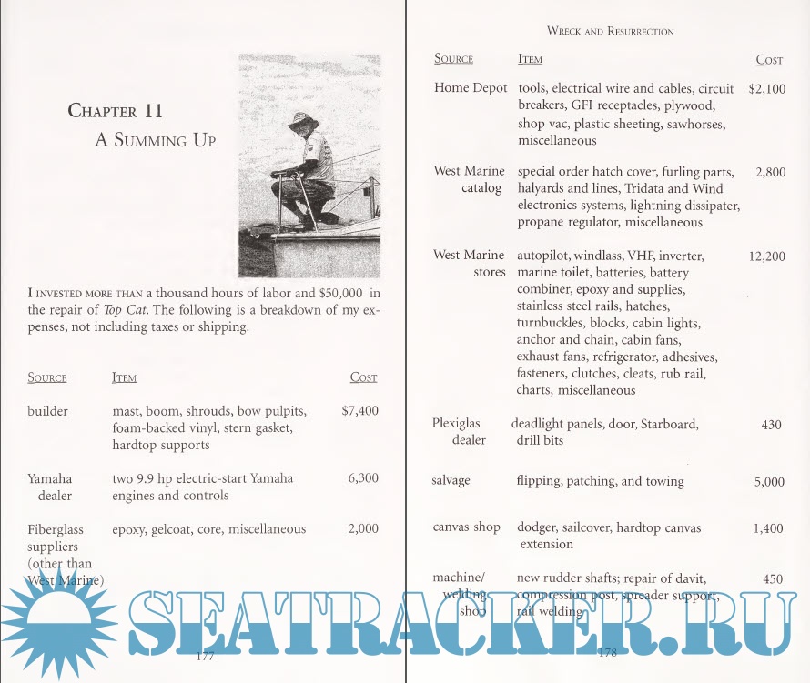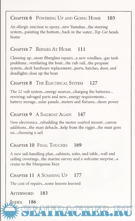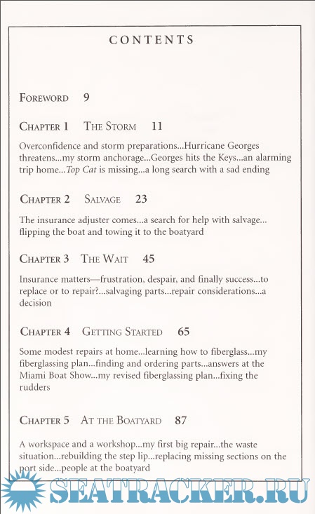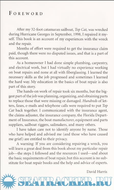 Year: 2001 Language: english Author: David Harris Genre: Technical book Publisher: Tortuga Books Edition: First ISBN: 9781893561038 Format: PDF Quality: Scanned pages Pages count: 195 Description: After my 32-foot catamaran sailboat, Top Cat, was wrecked during Hurricane Georges in September, 1998, I repaired it my self. This book is an account of my experiences with the wreck and the repair. Months of effort were required to get the insurance claim paid, though there were no disputed issues, and that is a part of this account. As a homeowner I had done simple plumbing, carpentry, and electrical work, but I had virtually no experience working on boat repairs and none at all with fiberglassing. I learned the necessary skills as the job progressed and sometimes I learned the hard way. My education in the basics of boat repair is also part of this story. The hands-on work of repair took six months, but the big gest part of the job was planning, organizing, and obtaining parts to replace those that were missing or damaged. Hundreds of let ters, faxes, e-mails and telephone calls were required to put Top Cat back together. I communicated with the insurance agent, the claims adjuster, the insurance company, the Florida Depart ment of Insurance, the boat manufacturer, equipment and parts suppliers, sailboat riggers, sailmakers, and many others.
