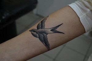 Ласточка – ласточки, птицы счастья и удачи, символ весны, утра, возрождения, надежды была весьма популярна среди моряков. Татуировку ласточка (иногда воробья) моряк делает только после прохождения им 5000 морских миль. Ласточка означала безопасный путь домой, так как ласточки летают недалеко от земли и приземление ласточки на корабль означало, что земля где-то близко. А после прохождения 10000 миль моряк мог сделать вторую птицу на второй стороне своего тела. Стая ласточек – признак хорошего путешествия. Считалось, что ласточки, изображенные на теле моряка, спасут его во время кораблекрушения. Если моряк тонет, ласточки его спасут, подняв в небо на крыльях.