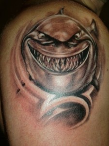 Татуировка в виде Акулы считается также неким оберегом от них же. Акула считается одним из самых опасных животных, природа создала ее идеальным хищником, ведь ей в одинаковой мере присущи скорость, мощь, сообразительность и кровожадность. Самая распространенная человеческая реакция на акулу – страх, восхищение и любопытство. Татуировки с изображениями акул, особенно белой – самой крупной, встречаются очень часто. Моряк тем самым показывает свое уважение к хищнику и веру в то, что не станет добычей.