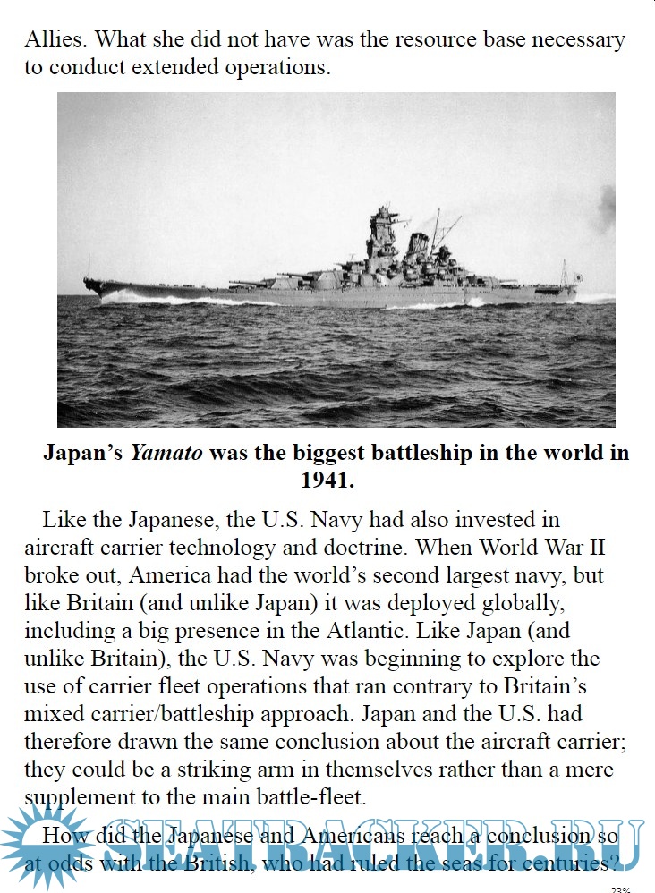 Description: Naval combat underwent a significant metamorphosis during World War II. Axis (Germany, Japan, Italy) built some of the most powerful battleships ever to rule the world's oceans. But the conflict witnessed the emergence and triumph of the aircraft carrier as the 20th century's true monarch of the seas. Submarine warfare expanded and developed, while aircraft technology and doctrine experienced several revolutionary changes. However, the Axis failed to secure either the seas or the skies, and their defeat in these theaters ultimately led to their doom, due to high command disinterest or simple lack of resources. Allied controlled the sea lanes and eventually ending much of the threat of U-boat attack, cleaning sea lanes for seaborne invasions. Indeed, the “ultimate weapon” of World War II proved to be not a specific type of tank or aircraft, but a combined power of both air and naval operations, deployed by the aircraft carrier. The book looks at the course of the fighting in the Atlantic and Pacific during the war, and the changes both sides made in an effort to establish supremacy.