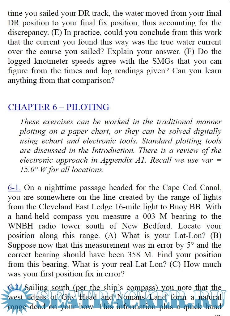 This manual is a complete, rich and exhaustive collection of exercises, designed to improve navigation skills in both routine and special circumstances. A large amount of practical exercises, along with answers and numerical solutions is provided, on chart reading and plotting, position fixing, dead reckoning, compass work, and the use of special publications such as Chart Catalogs, Tide Tables, Current Tables, Light Lists, Notices to Mariners, Chart No. 1, Navigation Rules, and U.S. Coast Pilots.