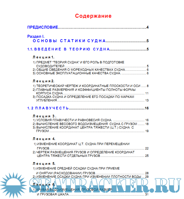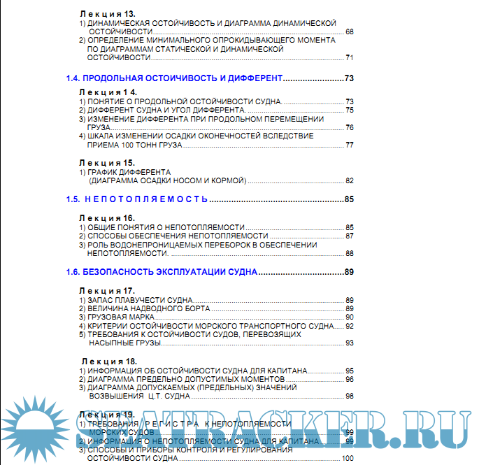 В учебном пособии сложно показать все возможные варианты шкал, диаграмм, таблиц и т.п., которые могут встретиться на практике на разных судах. Однако это учебное пособие поможет получить такой уровень подготовки по теории судна, который позволит судоводителю в будущем самостоятельно развиваться и самосовершенствоваться, что даст, в свою очередь, ему возможность, проработав соответствующие судовые документы, подготовить себя к работе на любом судне.