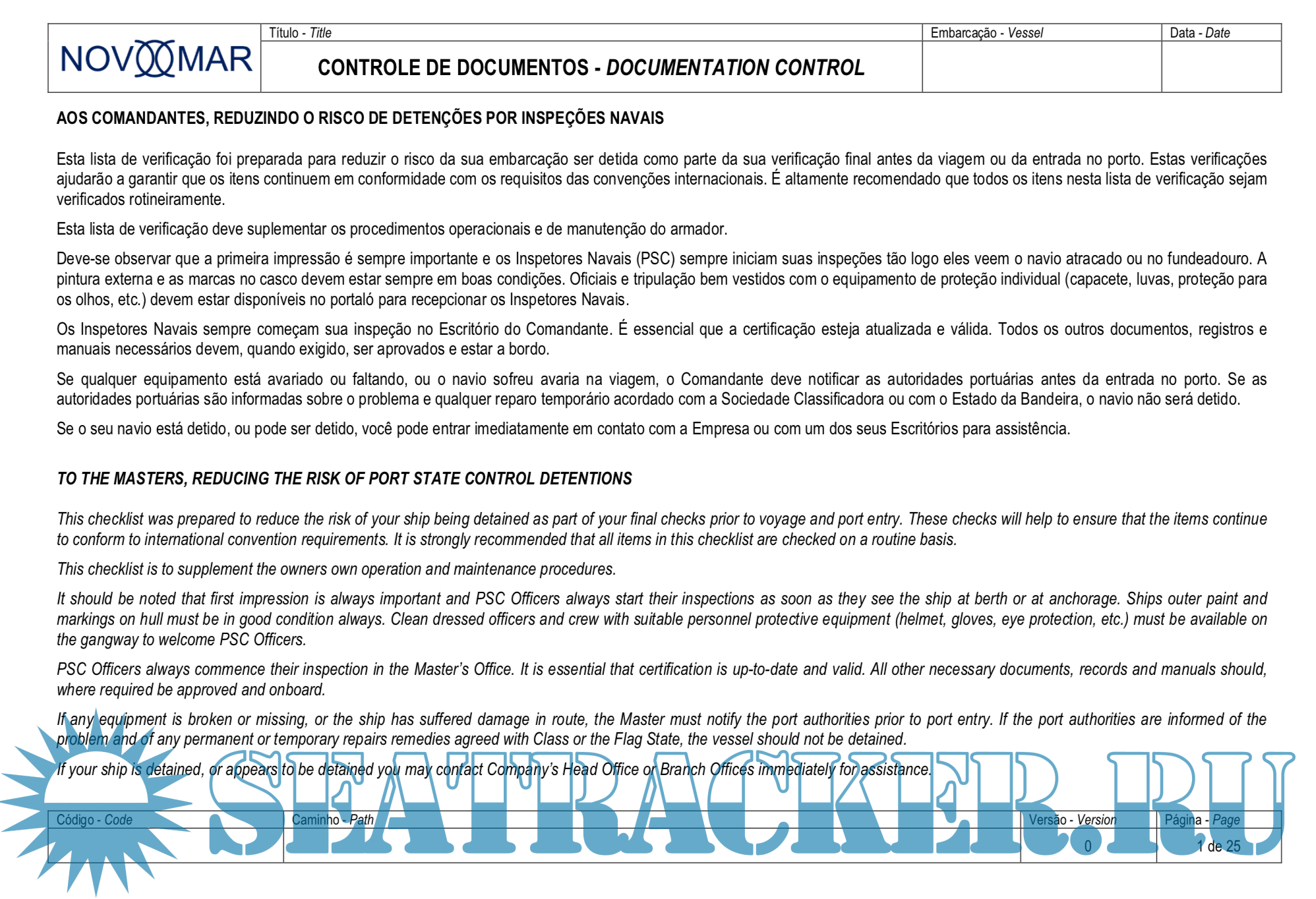 Description: This checklist was prepared to reduce the risk of your ship being detained as part of your final checks prior to voyage and port entry. These checks will help to ensure that the items continue to conform to international convention requirements. It is strongly recommended that all items in this checklist are checked on a routine basis.