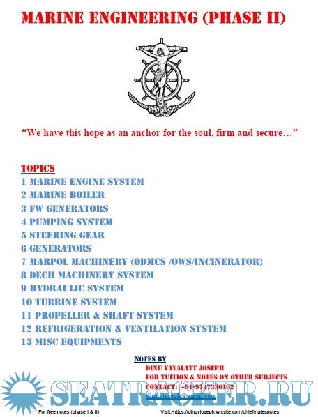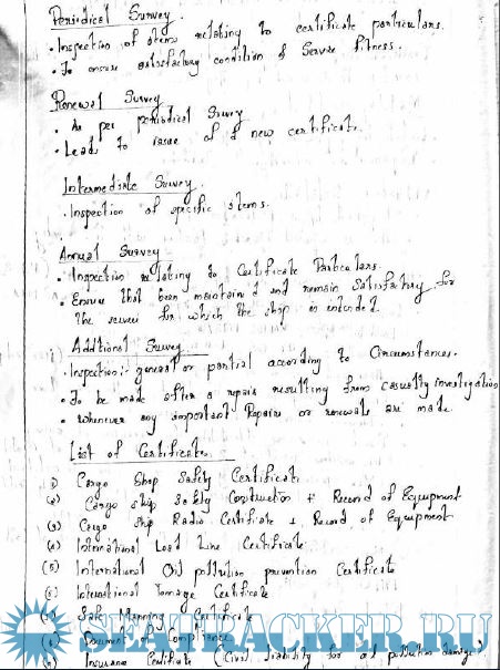 Year: 2021 Language: english Author: Dinu Vayalatt Joseph Genre: Collection of books Format: PDF Quality: Photo of pages Pages count: >100 Description: Handwritten notes on: 1) Bridge Watchkeeping, 2) Cargo Work, 3) Marine Engineering, 4) Maritime Law, 5) Meteorology, 6) Navigation, 7) Navigational Equipments, 8) Safety, Emergency & 9) Stability. As per syllabus prescribed by Mercantile Marine Department, India for the written examinations of Chief Mates (F.G.) Phase I & II.