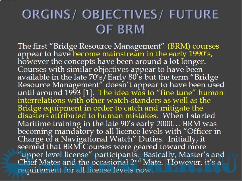 Year: 2xxx Language: english Author: Jeffrey Spillane Genre: Guide Publisher: SUNY Maritime College, USA Format: PDF Quality: Photos of pages Pages count: 43 Description: The purpose of this paper is to highlight the need to address specific weaknesses when teaching a course by highlighting a common mistake I (and several other instructors agree) have been seeing in entry level officers/officer candidates (little to no experience) enrolled in “Bridge Resource Management” (BRM) courses. It emphasises the need to take the student’s previous experience and comfort levels into account when designing and teaching a course. While I discuss BRM in detail, this paper could be a model for the method of evaluating the Objectives and balancing the student’s weakness to “fine tune” a course to provide the greatest benefit for the student.