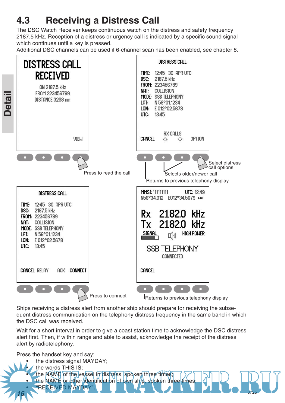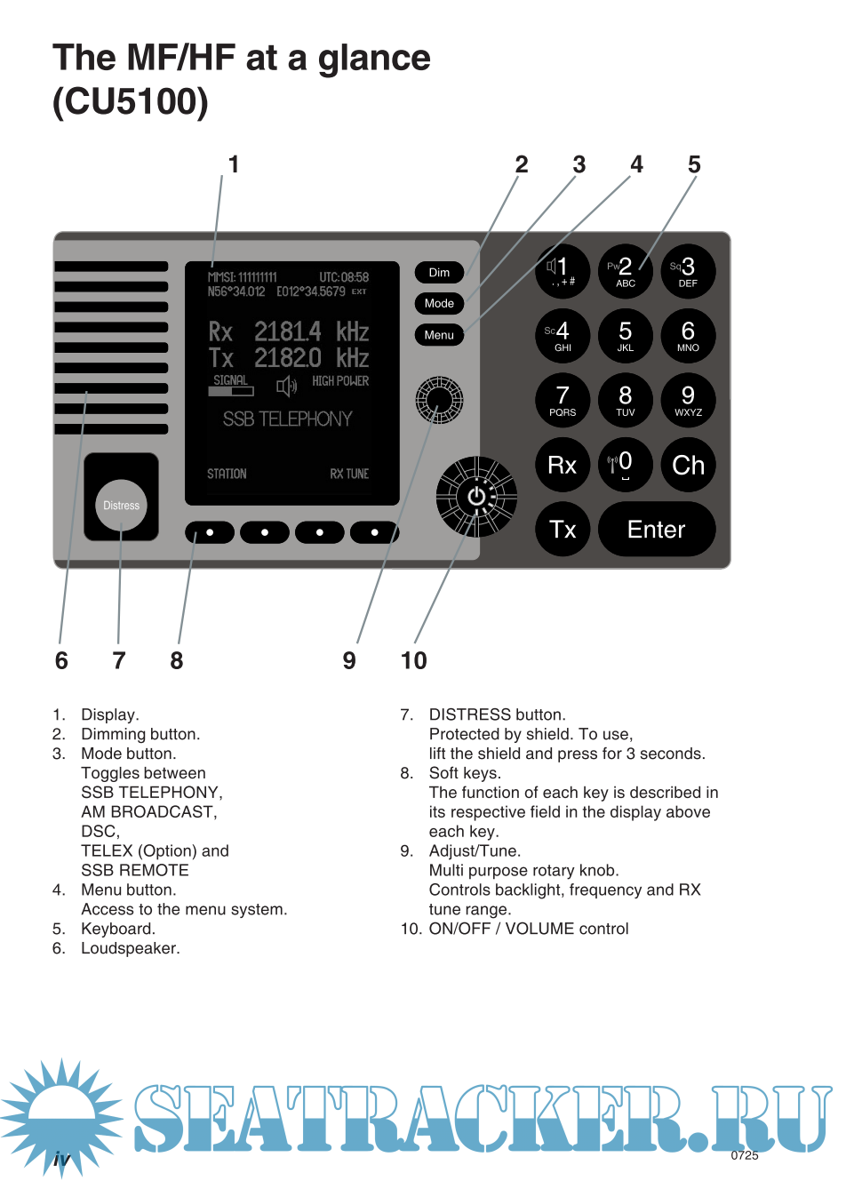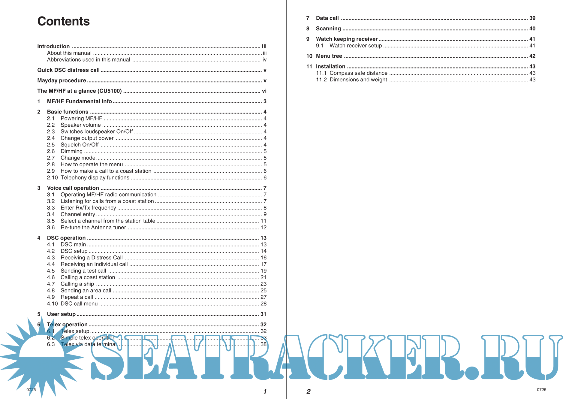 Description: Congratulations on your new SAM CU5100 MF/HF maritime radio telephone with built-in DSC (Digital Selective Calling) system, fulfilling the highest international standards for marine MF/HF communication and safety procedures. The transceiver is born with a 2187,5kHz DSC watch receiver forming an ideal system for MF GMDSS installations. The transceiver can easily be upgraded for 6 channel scanning DSC watch receiver and Telex operation to comply with MF/HF requiements in sea area A3. If connected to a GPS or other maritime navigation system it can automatically include the true UTC time and your position in its DSC distress messages. For an explanation of DSC, see page 2.
