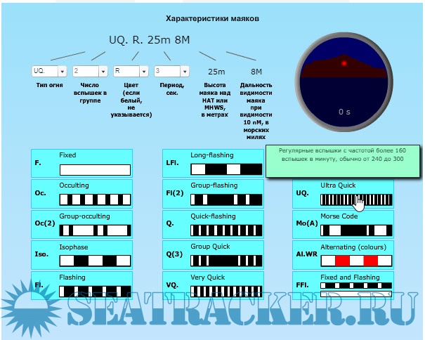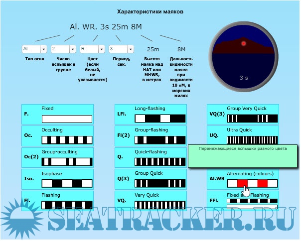 Для выбора фазовых характеристик, числа вспышек в группе, цвета огня и периода используйте органы управления в верхней части экрана программы.